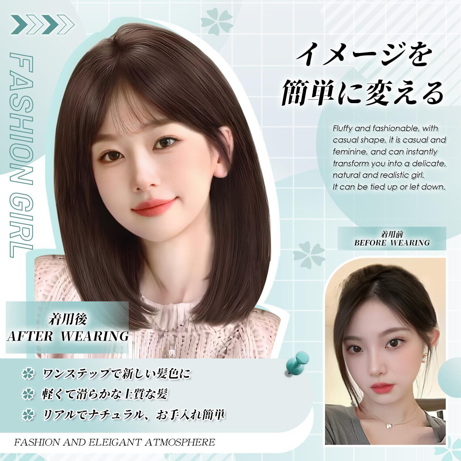 ❀ディテール:高級なファイバーでウィッグ特有のテカリがなく、自然感たっぷり。分け目は人工頭皮(スキン)付きなので、上から見られてもとっても自然。分け目で髪型の印象も変わり、簡単にイメージチェンジ。ふんわり張り付かない前髪のふかし加工、前髪の根元に短い毛をいれた「ふかし加工」で、額に張り付かずふんわり!ヘアネットが2つ付属しており、ウィッグは届いてすぐに使用することができます。