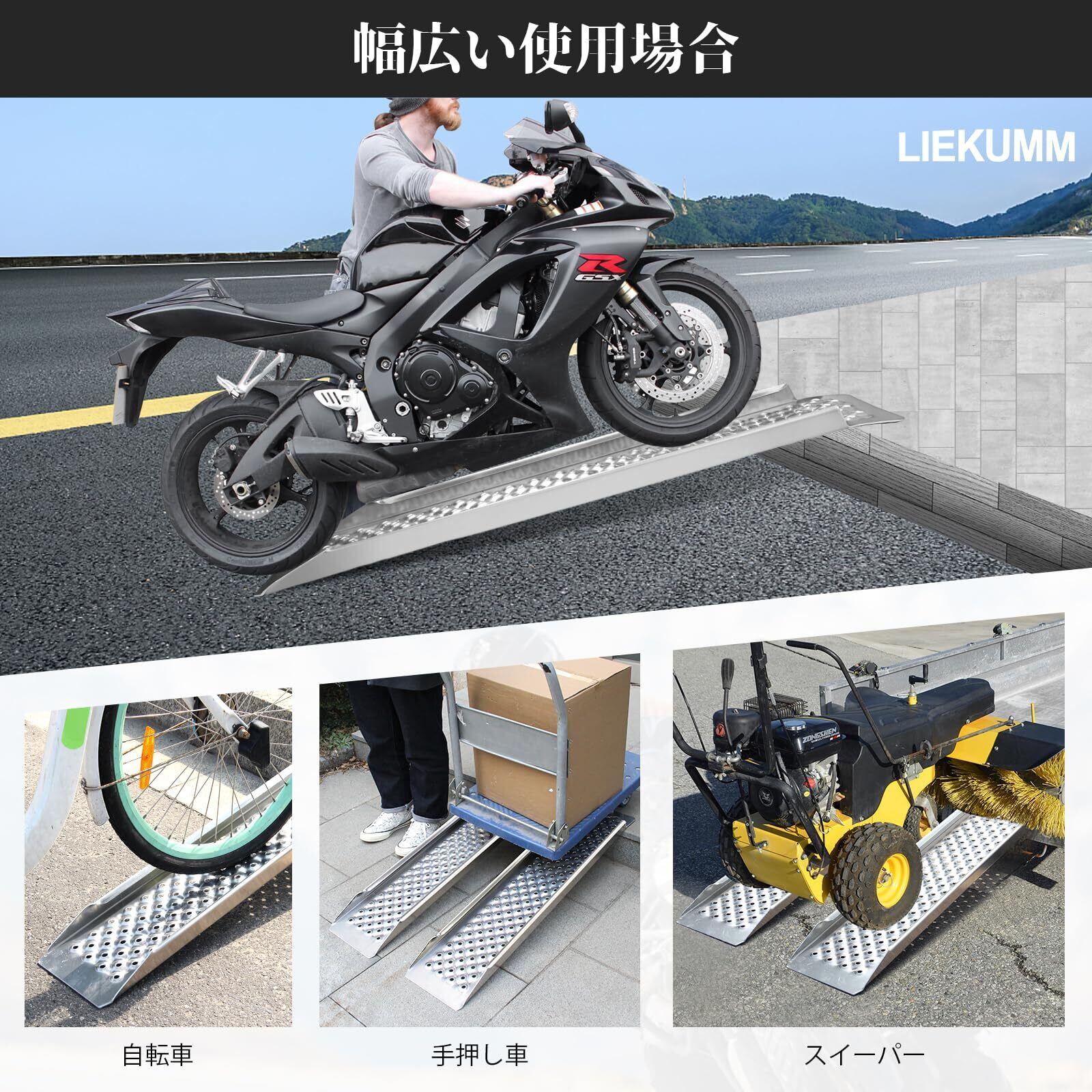 幅広い対応:1本使用時の耐荷重は300kgで、自転車やオートバイに最適。2本を組み合わせることで600kgまで対応可能となり、スノーモービル、ATV四輪バギー、農機具、草刈り機、除雪機など様々な機器にご利用いただけます。物置やガレージ、倉庫への搬入にも便利です。