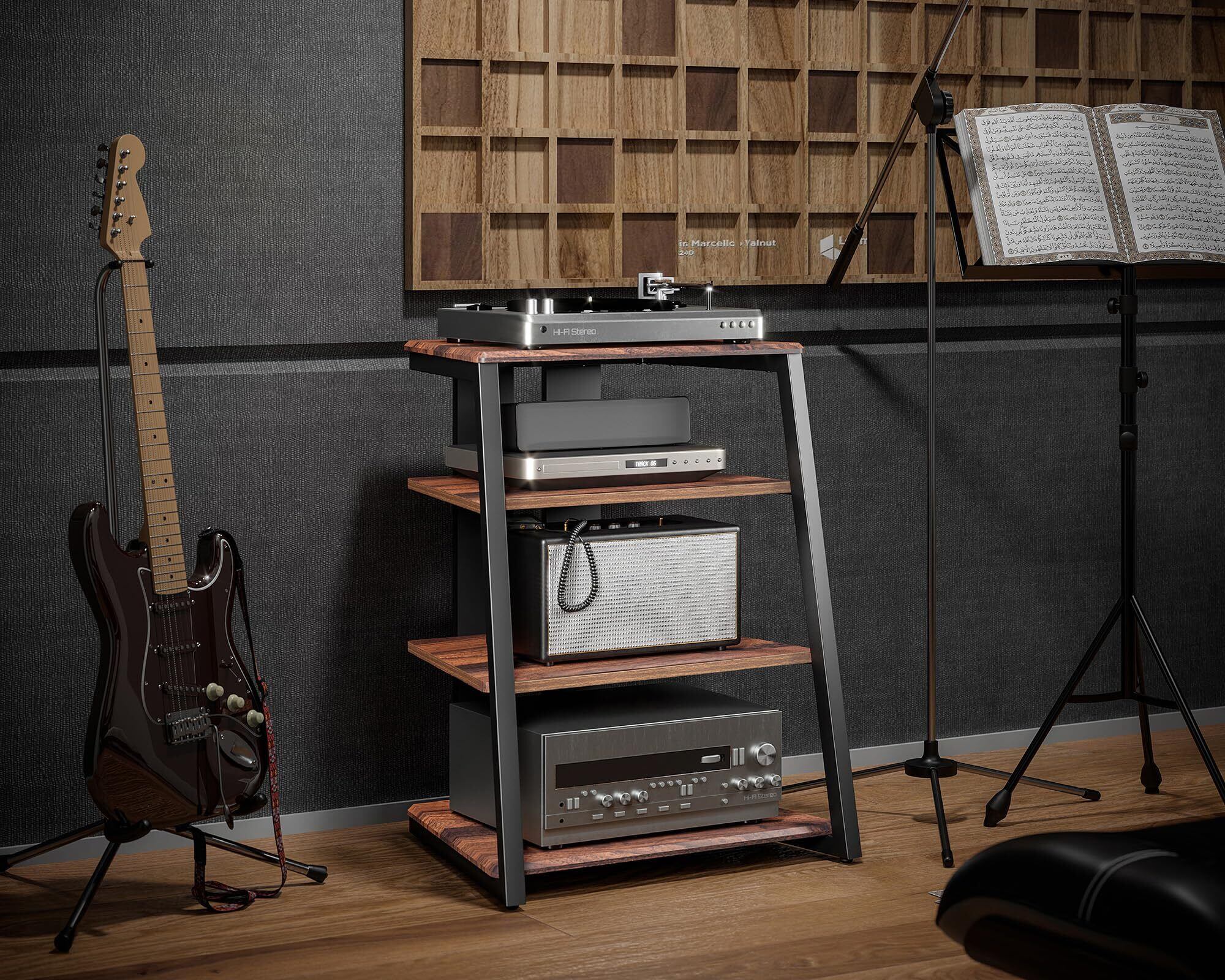 FITUEYES DESIGN オーディオラック インテリア 台形 木目調仕上棚板 AV ラック スチール製フレーム 裏面配線 ピッチ調整可 ウォールナット+ブラック エッフェルシリーズ F07F4061L