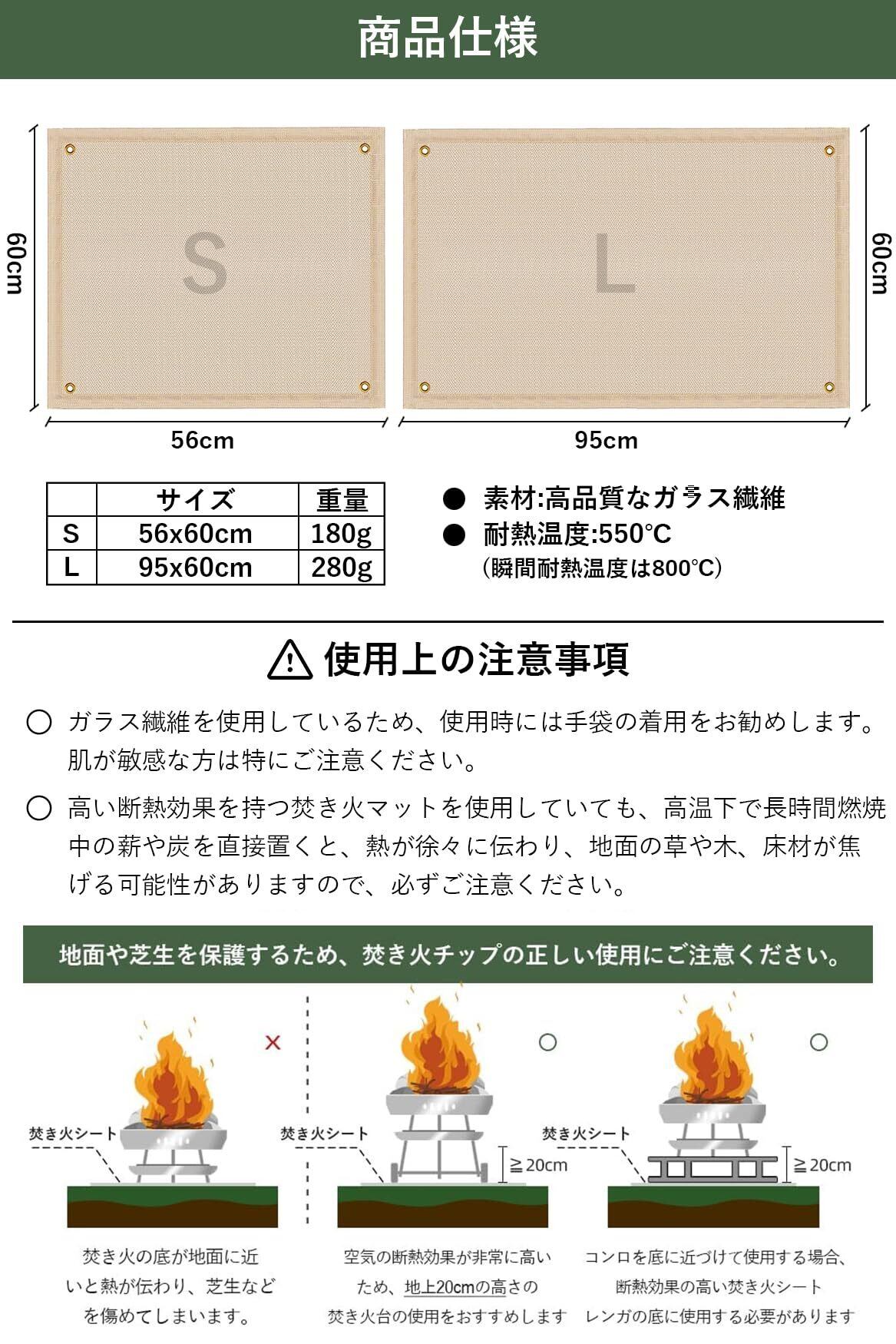 【さらに多くのサイズ選択肢】不燃シートは縫い目が密着しており、56×60cm、60×95cm、95×100cmの3種類のサイズがあります。焚き火シート、耐热シート、防火シート、薪シートなどのベースシートとして使用でき、ユーザーは必要に応じてサイズを選択できます。また、折りたたみ可能で携帯に便利で、収納袋が付属しています。