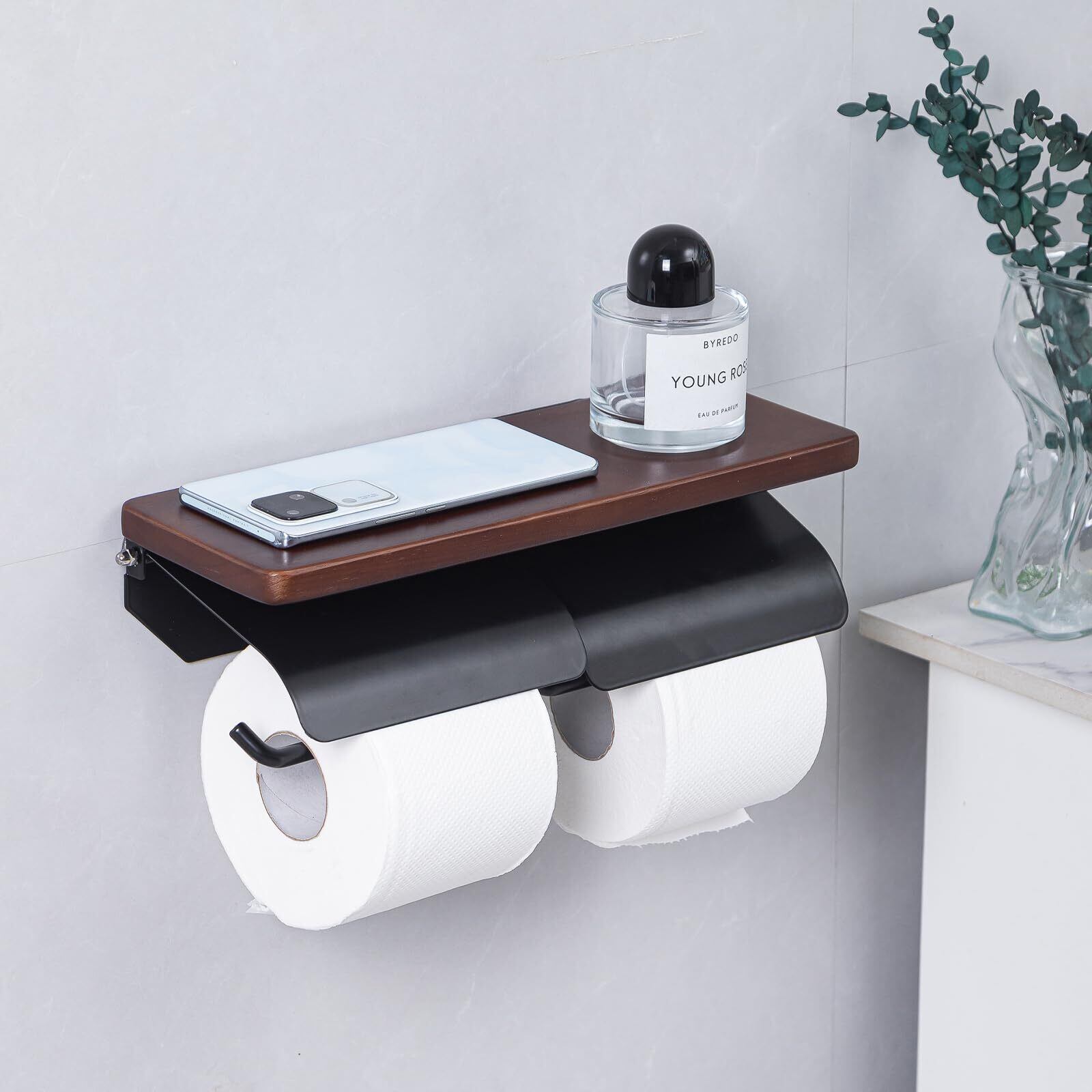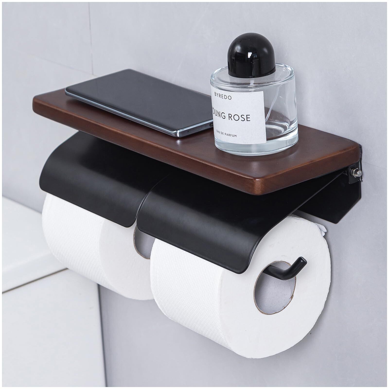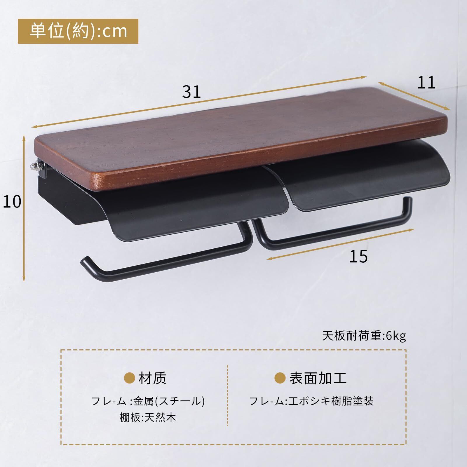 ヲんシウ トイレットペーパーホルダー 天然木 天板付き おしゃれ ダブル 紙巻器(ダークブラウン×ブラック,ダブル)