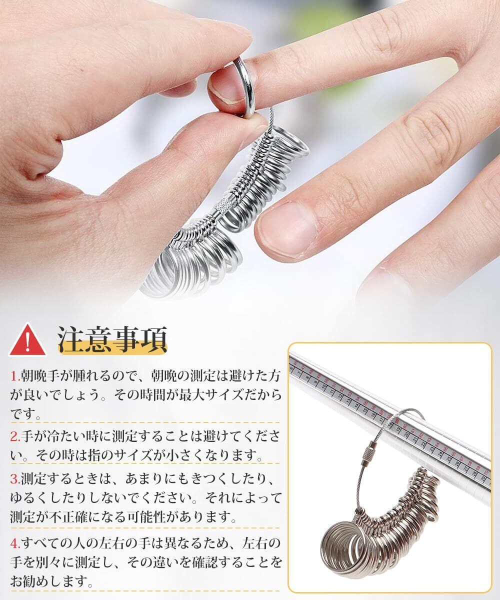 測定時のご注意:リングゲージ 自体の重さで 指 と ゲージ の間に隙間ができ、実際の サイズ より緩くなる場合があります。測定時には、ワイヤーから外すかや手のひらに接地させてお測り下さい。指輪を着ける指の腹より第二関節が太い方は、関節が無理なく通るサイズが適正なサイズとなります。体調などで指のサイズが変化することがございますので、朝夕それぞれ1回ずつ測定してください。