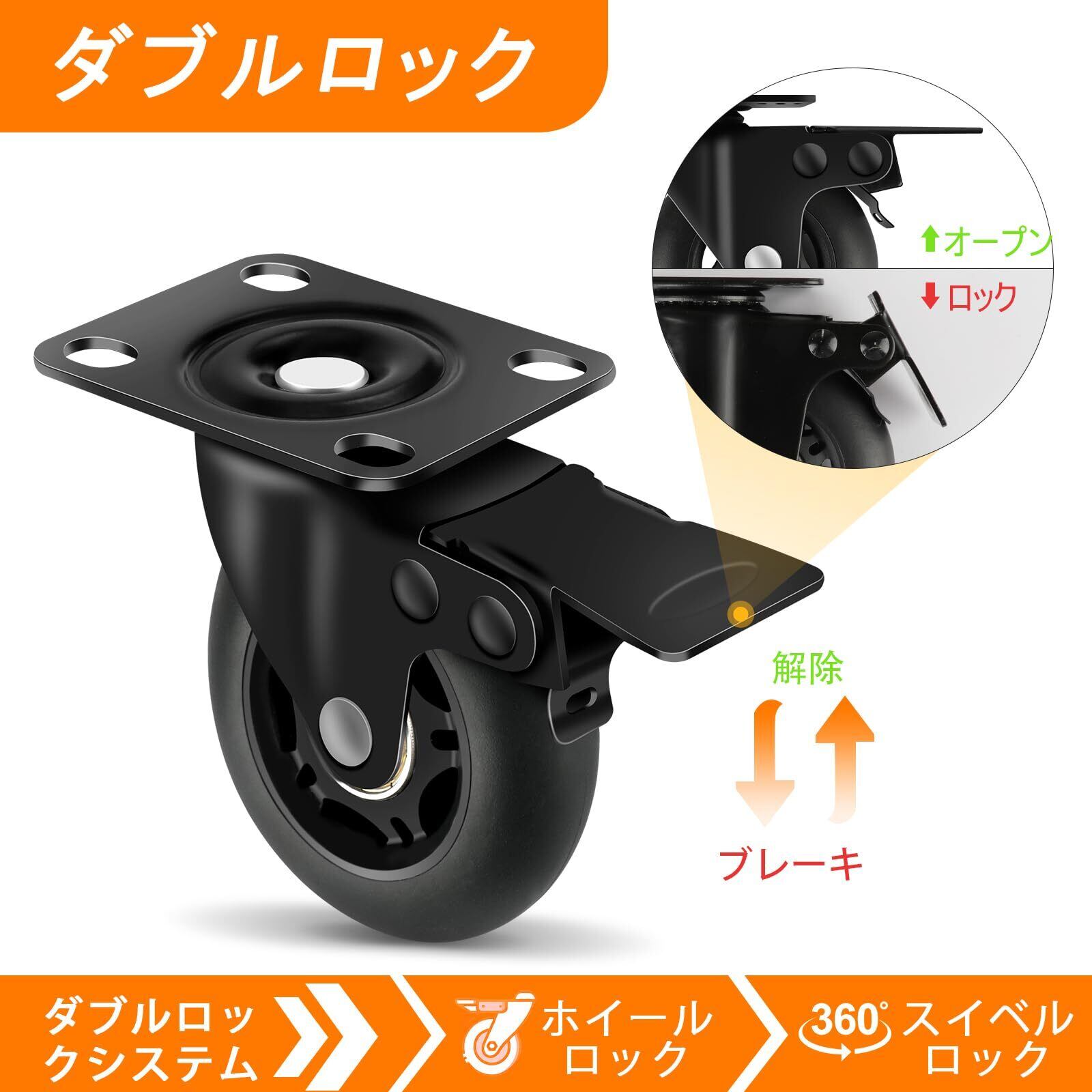 【二重ロック機能】: 当社の高品質キャスター ストッパー付きは、独自の『 回転ロック + 移動ロック』 二重ロックシステムを採用しています。フットペダルを軽く踏むだけで、二つのロックが同時に作動。車輪 キャスターは動きを止めると同時に回転も止め、完全に静止した状態になる。坂道でも車輪が意図せず滑る心配がなく、作業者と貨物の安全で迅速な移動を確保します。