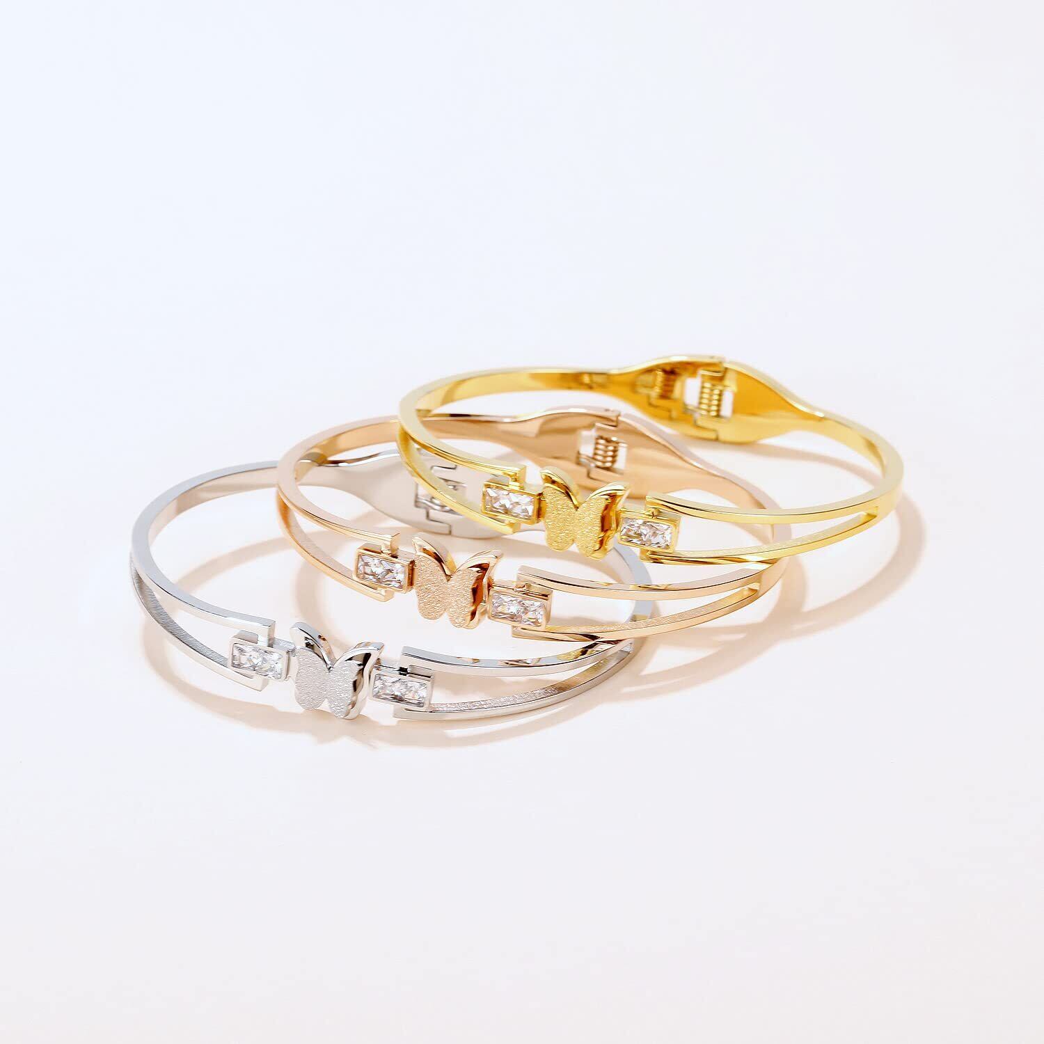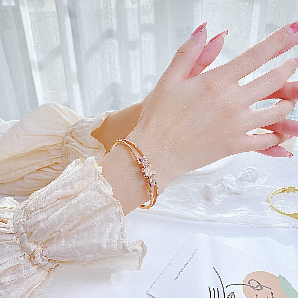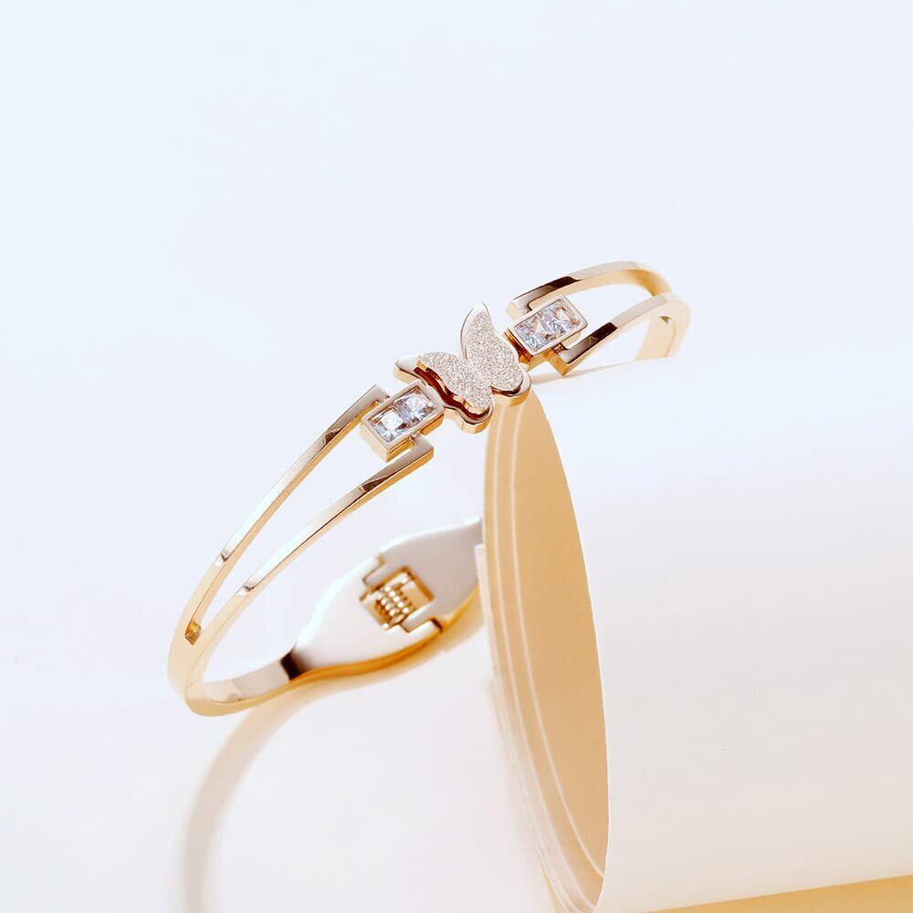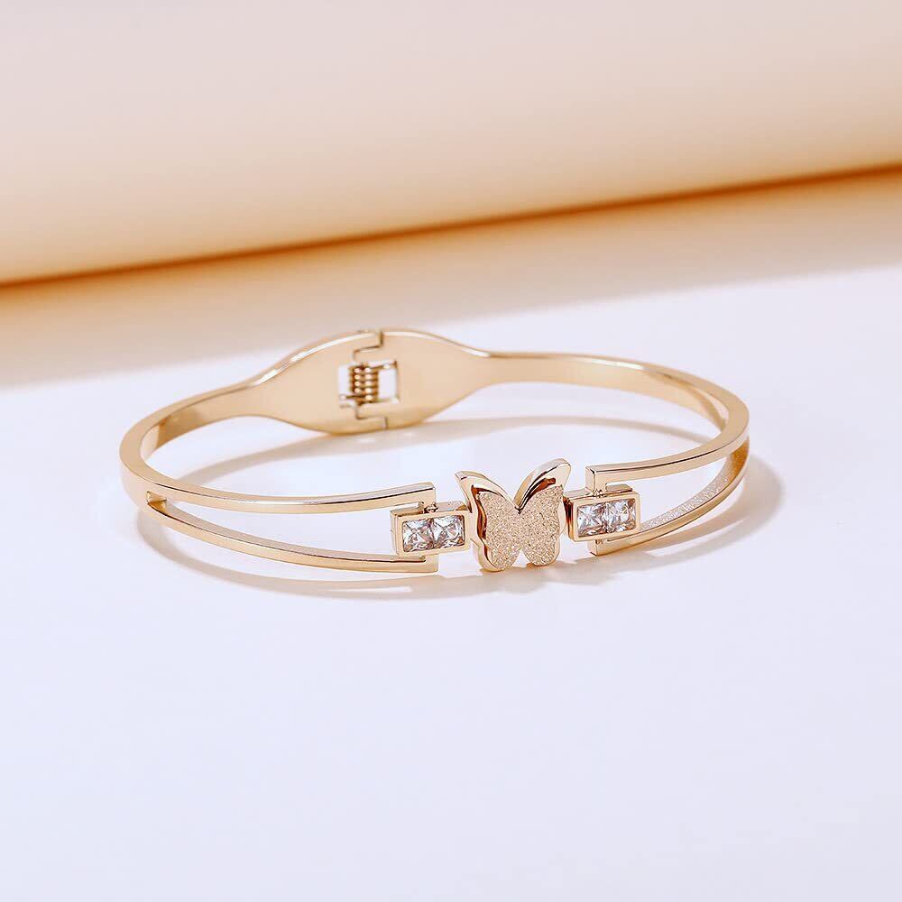 【Rockyu バングル】蝶モチーフ ブレスレット レディース ピンクゴールド。高品質ステンレスとジルコンを使用し、エレガントな外観を実現。長持ちし、日常使いに最適です。金属アレルギー対応で安心してご使用いただけます。