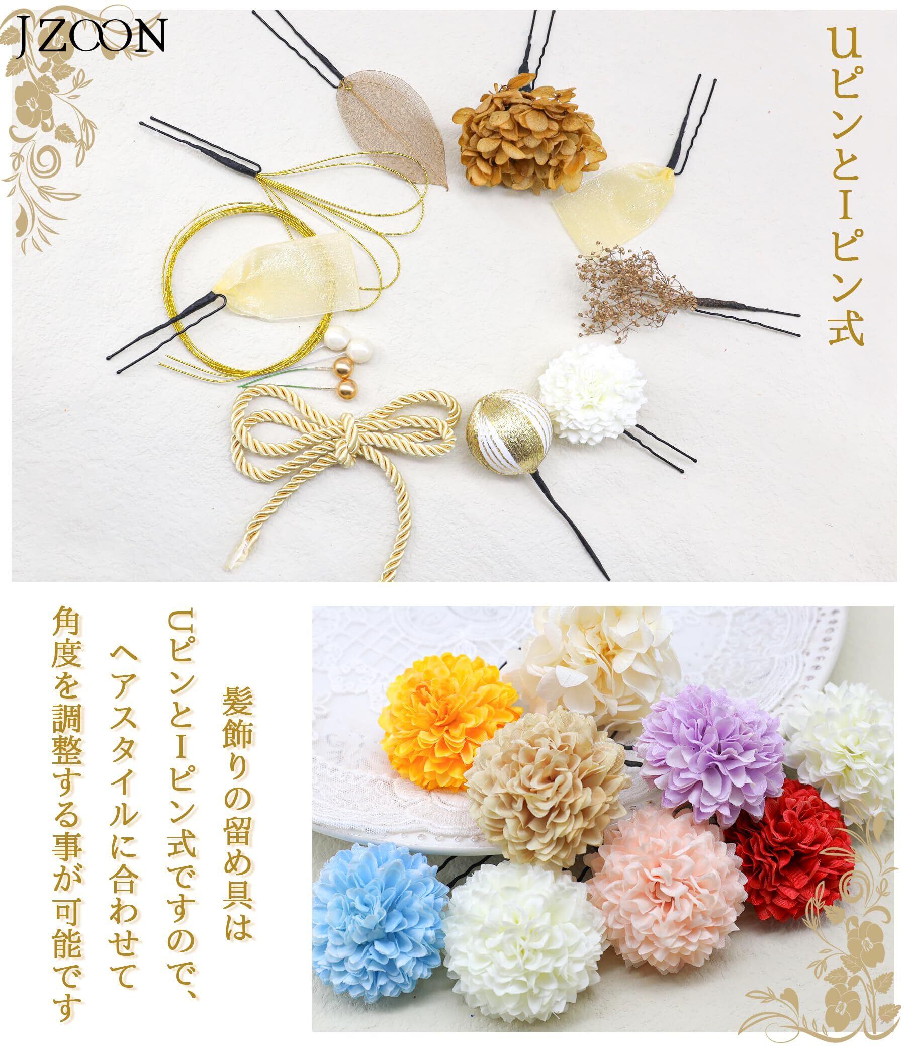 デザイン:お花はUピンの設計で、使いやすくなり、一人片手で付けることができます。全8色アジサイ· ピンポンマム·水引·ミニスケルトンリーフなど組み合わせの髪飾りは伝統的な着物に合わせて可愛らしく、優しい質感が際立ちます。