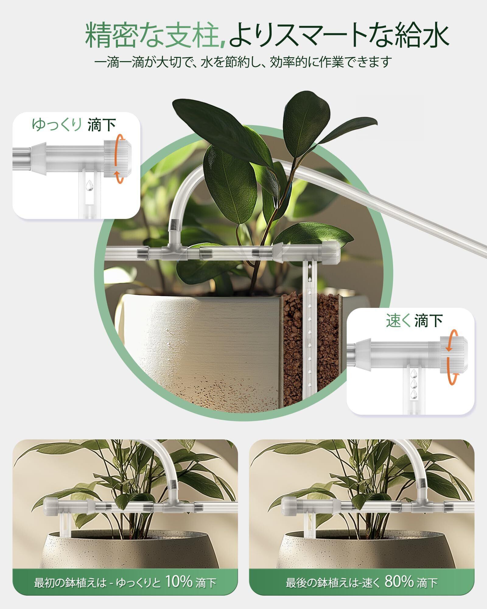精密な植物の世話のための流量調整可能な給水機能。流量調整可能な注水ステークを使って、あなたの各植物に合わせて給水をカスタマイズしましょう。繊細な屋内植物を世話している場合でも、丈夫な屋内植物を育てている場合でも、この屋内植物用の給水システムにより、最適な水分量を与えることができ、各植物に必要なだけの水分を確実に与えることができます