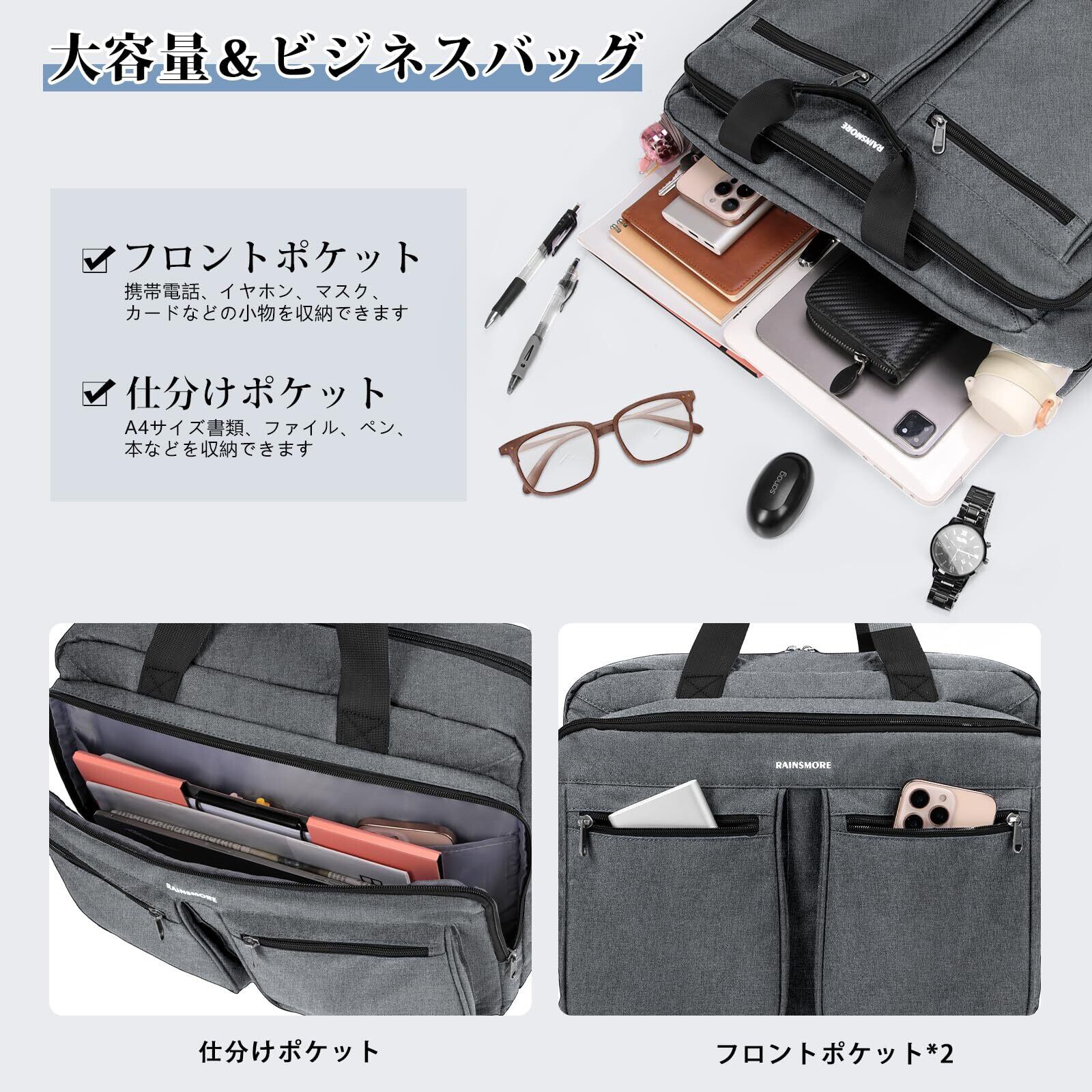[RAINSMORE] ビジネスバッグ メンズ 就活 バッグ メンズ 大容量 3way 軽量 ブリーフケース 15.6/17.3インチ対応 リクルートバッグ A4対応 ショルダー掛け 耐衝撃 撥水 通勤 通学 面接 出張 ブラック グレー