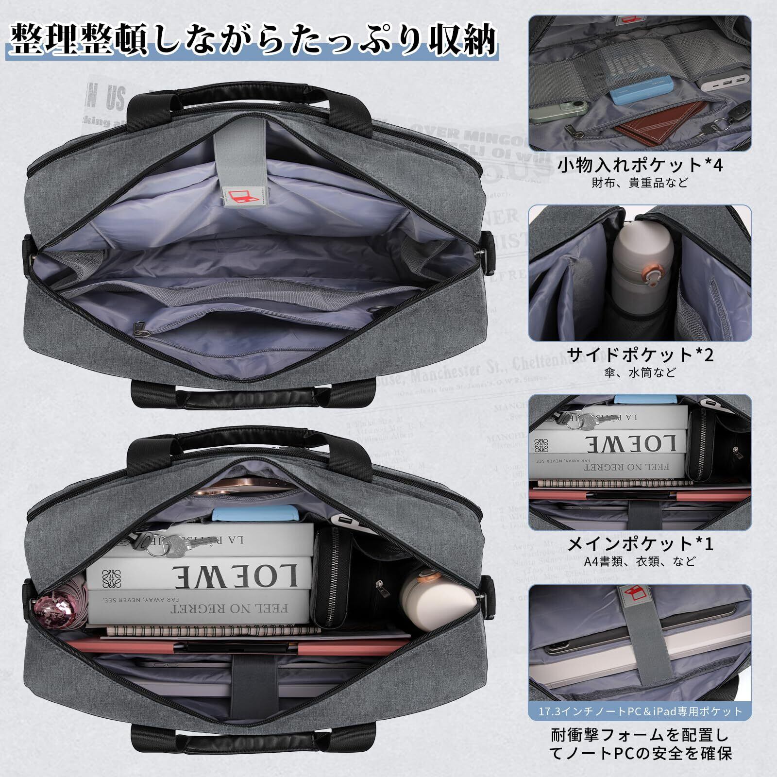 大容量・たっぷり収納力:このメンズビジネスバッグの外部と内部はたくさんのポケットを設けて、物がどこにある一目瞭然です。外部には小物入るポケット2つ+大型ポケット1つを装備して、大型ポケットの内側にペン差し2つ+スリップポケット2つを付いて、A4サイズ書類、ファイル、ペン、本、イヤホン、マスク、カードなどを収納できます。内部にはメッシュスリップポケット5つ+貴重品ファスナポケット1つ+A4書類対応のメインポケット1つ+15.6型ノートPC専用ポケット1つ+iPad専用ポケット1つがあり、15.6型ノートパソコン、iPad、A4書類傘、水筒財布、携帯電話、手帳などを楽にそれぞれ分けて収納できます。収納性と安全性に優れたビジネスバッグです。