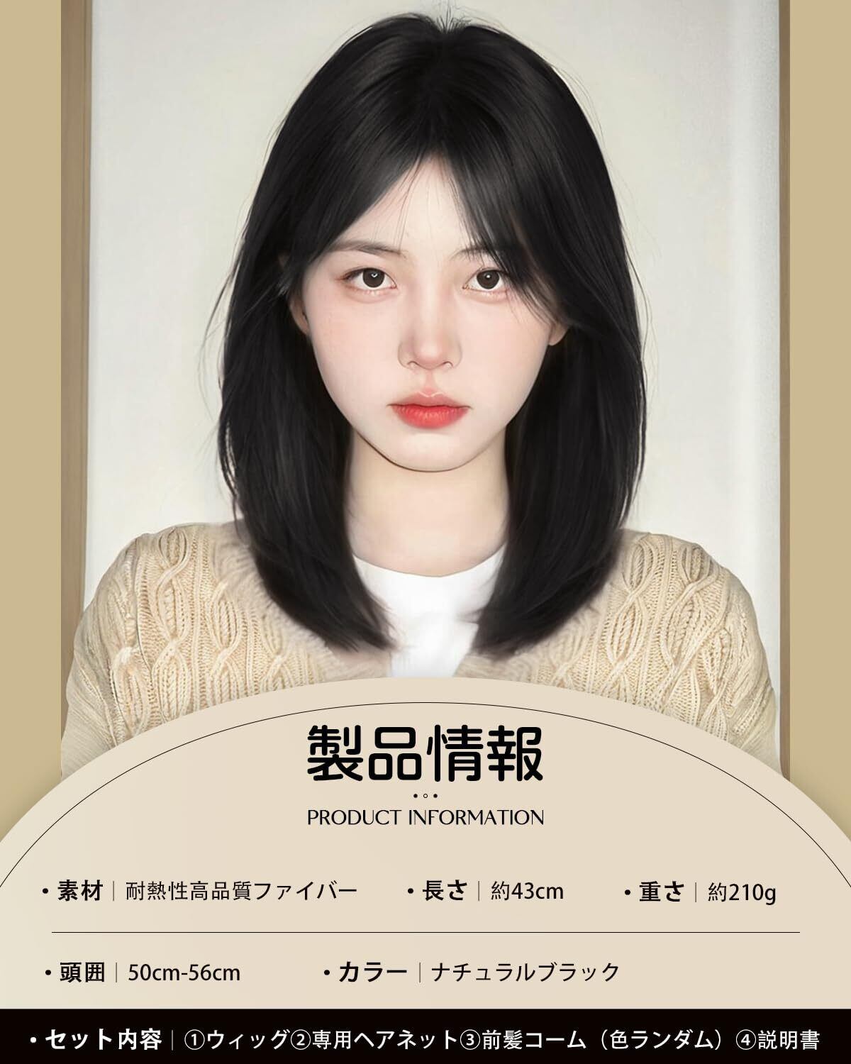 ❀【商品情報】①サイズ:長さ: 頭頂部から毛先まで約43cm、重量:約210g ②:頭囲約50〜56cmの方に適しています ③素材:高品質の耐熱繊維を使用し、160度までアイロンがかかるので、アイロン使用OKです ④カラー:アッシュブラウン、ナチュラルブラック、ブラックブラウン、オリーブブラウン ⑤セット内容:ウィッグ+専用ヘアネット+前髪コーム(色ランダム)+説明書