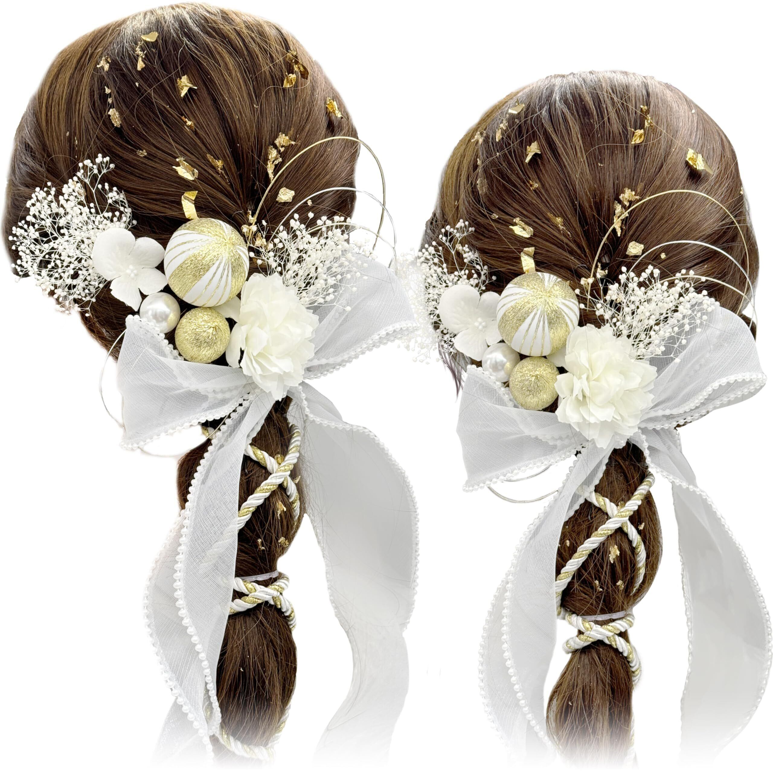 【優雅なデザイン】リボン、小さい花、組紐、ホワイトパール、和玉、かすみ草、ダリア、金箔、水引を華やかにする髪飾り11点セット。