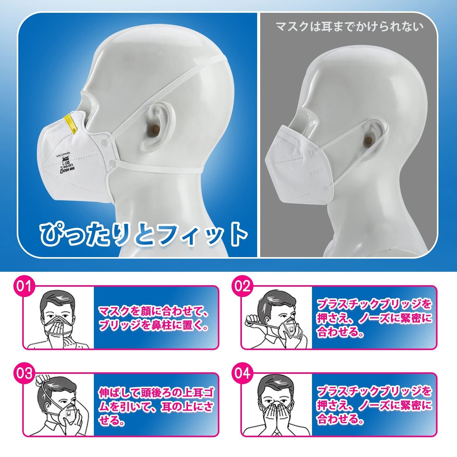 アメリカのNIOSHに承認されたN95マスクです。N95防護レベルを満たしています。メルトブローン布、柔らかな厚手の不織布で粒子95%以上をブロックします。花粉、PM2.5やハウスダスト等をブロックします。