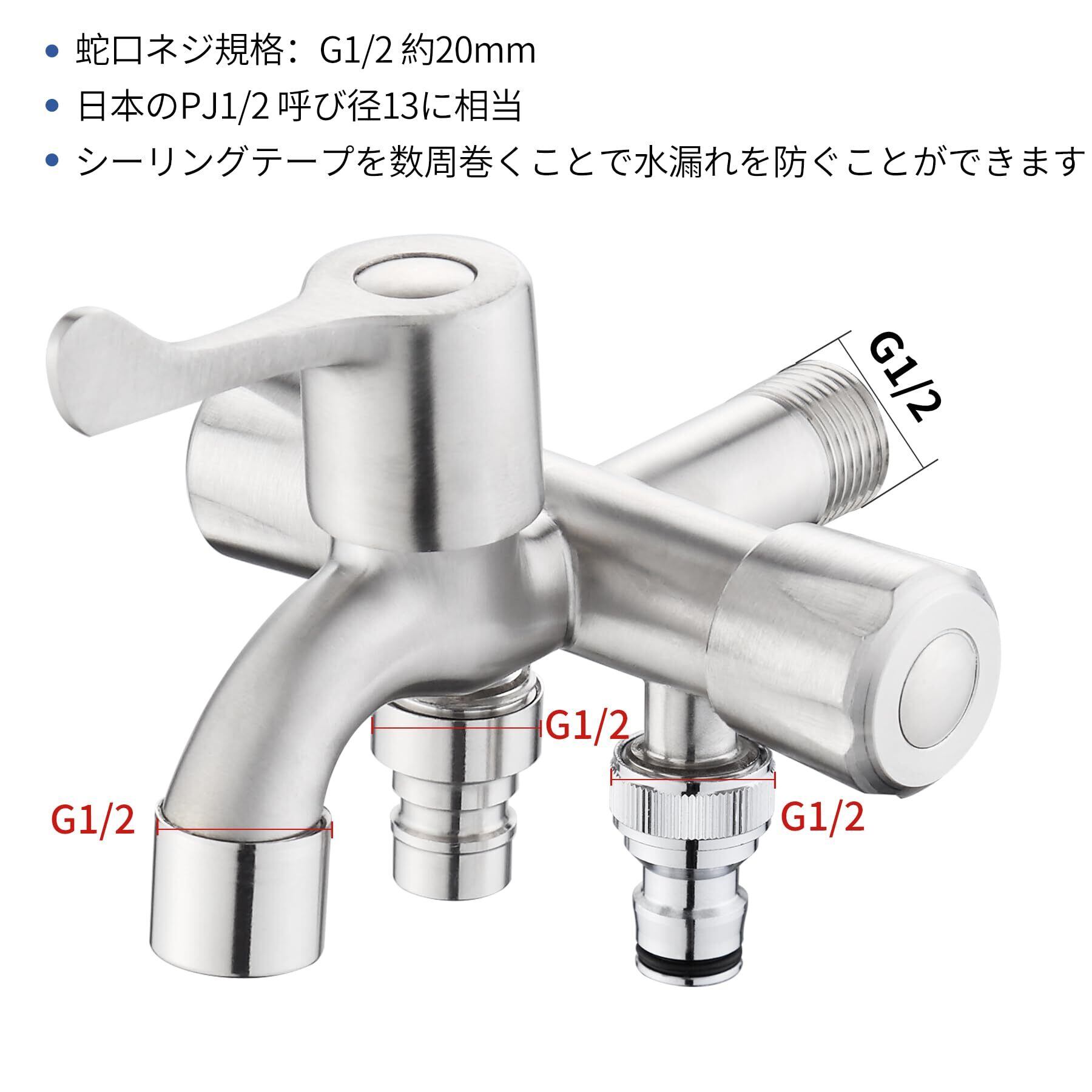 取り付け簡単:20mシールテープ付き,この3分岐蛇口は壁付け設置が可能。ねじ接続規格は国際基準G1/2、取付穴径約20mm,日本規格PJ1/2/呼び13に相当。既存のパイプとの互換接続を実現。漏水防止のコツ!取り付け前にシールテープを蛇口のねじ部分に約10回巻き付けます,全周にわたり均一な厚みを確保。
