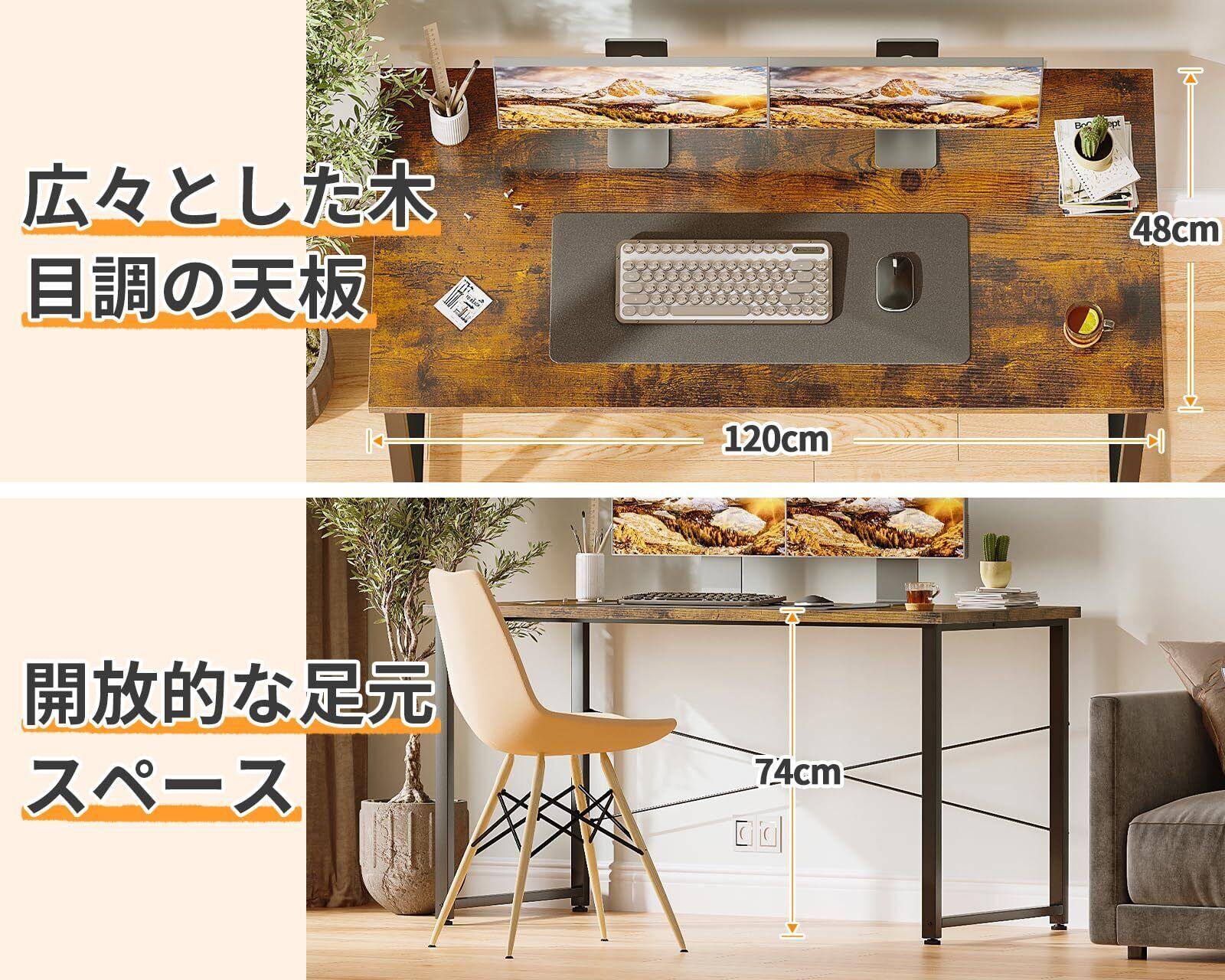 【商品仕様】シンプルでインテリアに馴染むおしゃれなデスクです。◆本体サイズ:幅120×奥行48×高さ74CM | 本体重量:9.3KG | 日本語組立説明書あり | お客様組立て品で、レンチも付属しており、別途で工具を買う必要がないです。