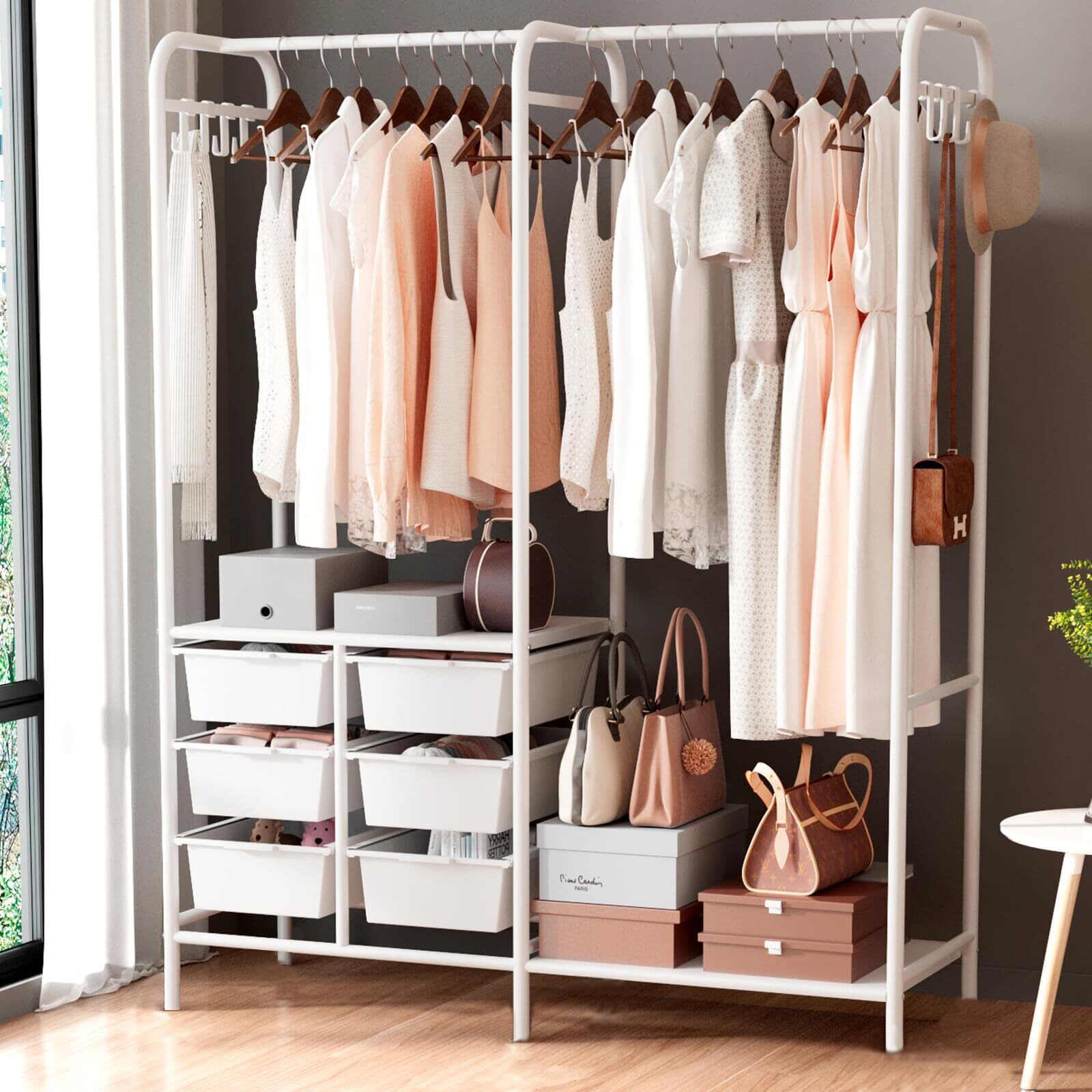 ハンガーラック 洋服ラック 引き出し 収納ケース付き 耐荷重250kg 頑丈 おしゃれ 多機能 大容量収納 省スペース 組み立て簡単 パイプハンガーラック 幅125x 奥行37 x 高さ160 cm ホワイト