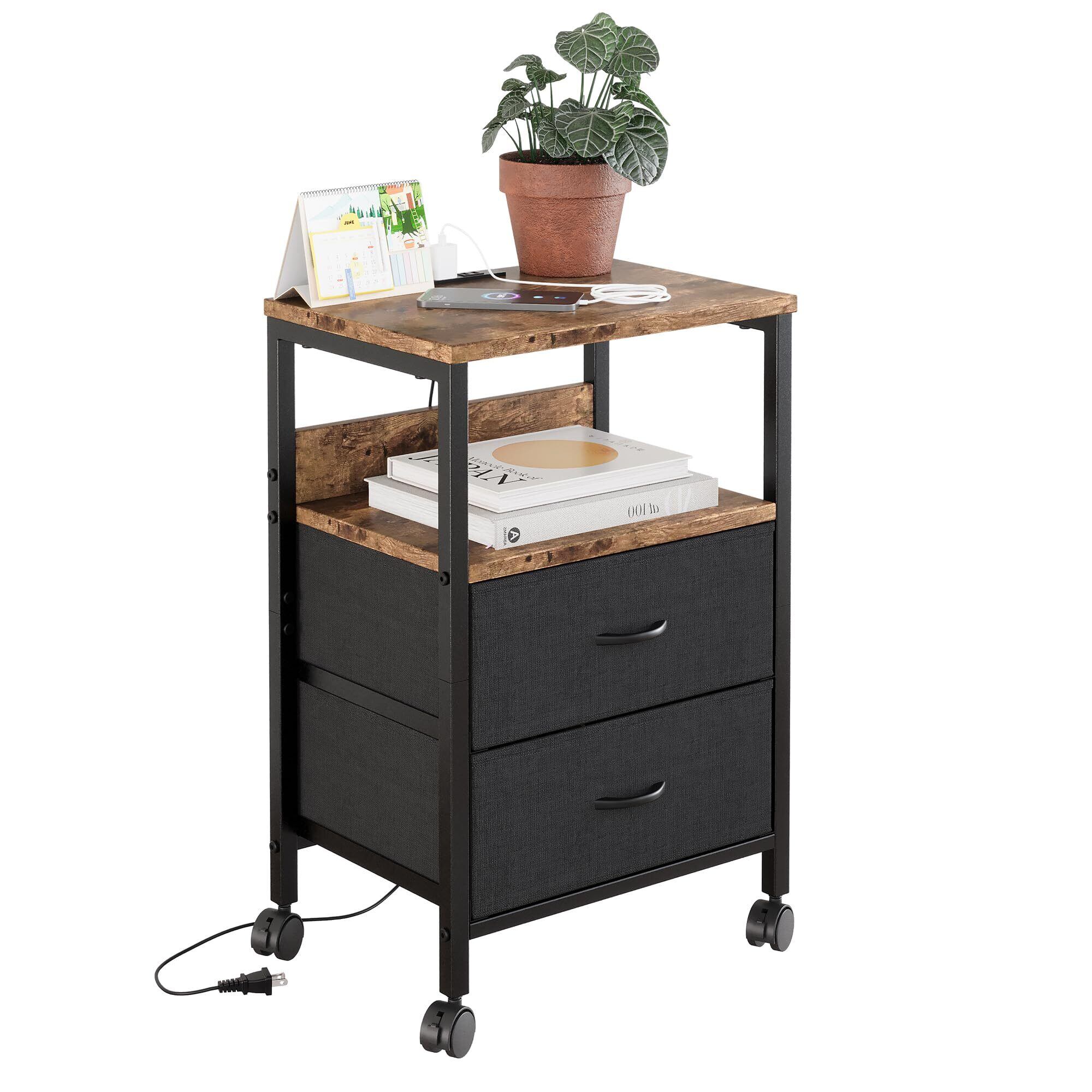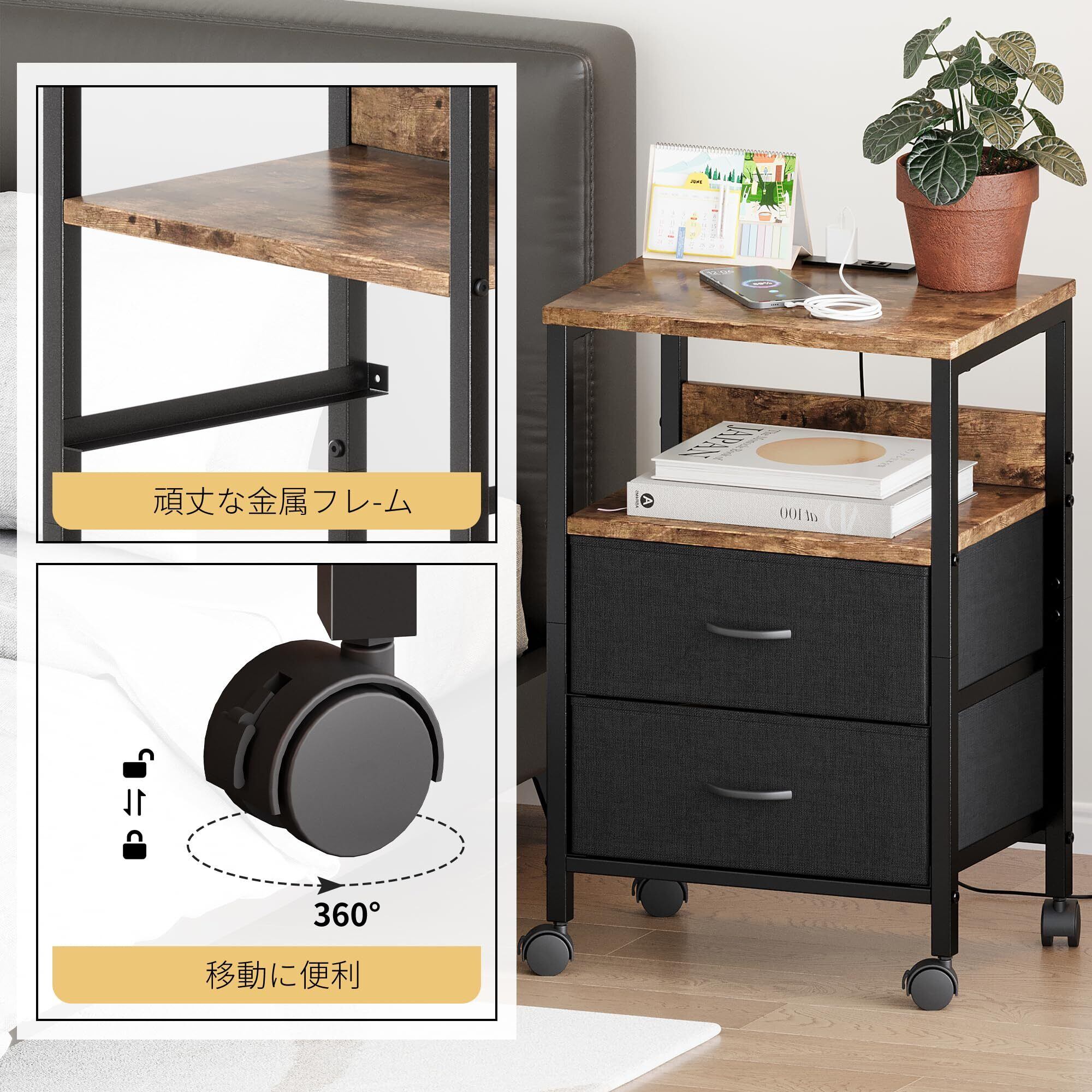 サイドテーブル キャスター付き ナイトテーブル 2つ引き出し付きのベッドサイド テーブル コンセント付き 可移動ナイトテーブル ベッド横 テーブル 北欧 洋服 タンス 天板付き (ビンテージ, 幅40×奥行30×高さ63cm)