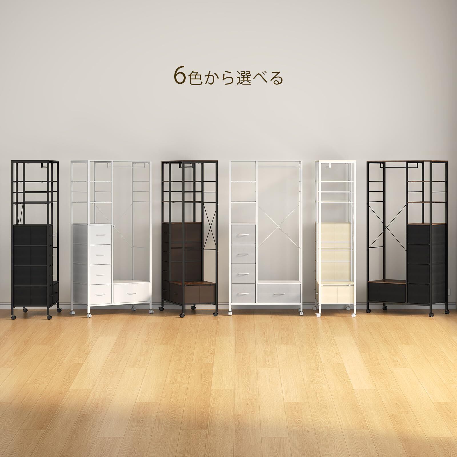 【省スペースで大容量収納が可能】LunarLight 多機能・大容量・スリム・おしゃれ ハンガーラックは、パイプデザインのワードローブ兼クローゼットで、引き出し付きの収納家具として洋服や各種衣類をコンパクトにまとめられる、収納力抜群の商品です。天板、底板、引き出し、内部棚板、ハンガーバー、S 字フックまで充実した収納スペースを備えているため、場所を取らずに多くのアイテムを整理整頓できます。4 つの小型引き出しと 1 つの大型引き出しを備えており、小型引き出し(別売り)は追加購入も可能で、空いている棚板に置くことで収納スペースを自由に拡張できます。付属のS 字フックを活用すれば、傘、バッグ、帽子、スカーフなどを簡単に掛けて、すぐに使える状態で保管できます。ベッドルームはもちろん、リビングルーム、ダイニングルーム、玄関など、家庭のあらゆる空間に自然に溶け込み、収納ニーズに応えます。