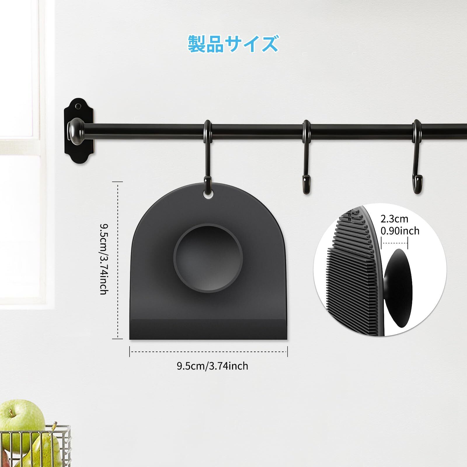 【携帯収納】クリーニングブラシはキッチンや浴室の滑らかな壁面に簡単に吸着します。ブラシ上部には吊り下げ用穴が付いており、使用後は壁やフックに掛けて乾燥させられます。これにより表面が壁に接触するのを防ぎ、キッチンスペースを節約しながら衛生的な使用をします。