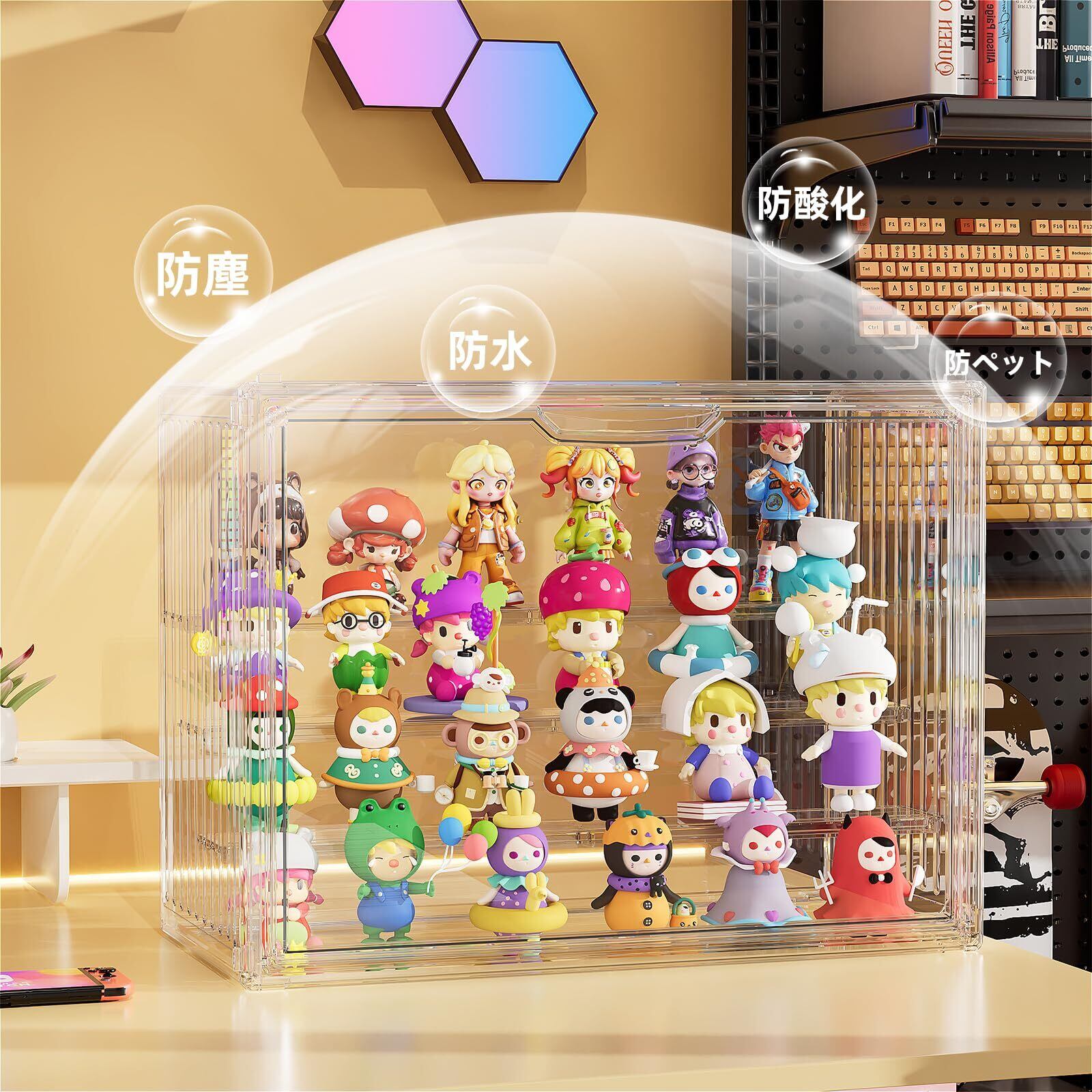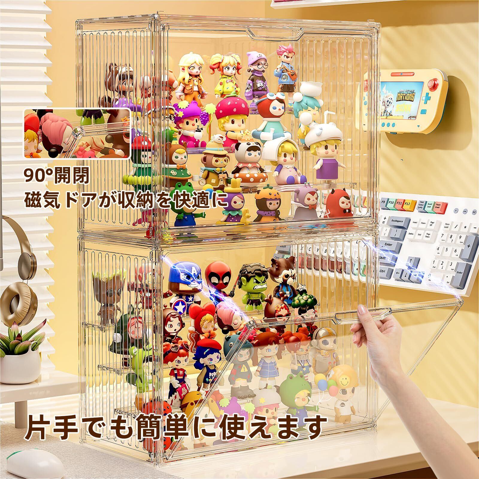 【便利な設計】このディスプレイケースは、自由にレイアウトできる可動式棚板(3枚付属)で、収納物に合わせてスペースを調整可能。90度開閉可能なマグネットドア、片手でもスムーズに収納物の出し入れができます。重ねてもずれない溝加工で、安定した積み重ねが可能。