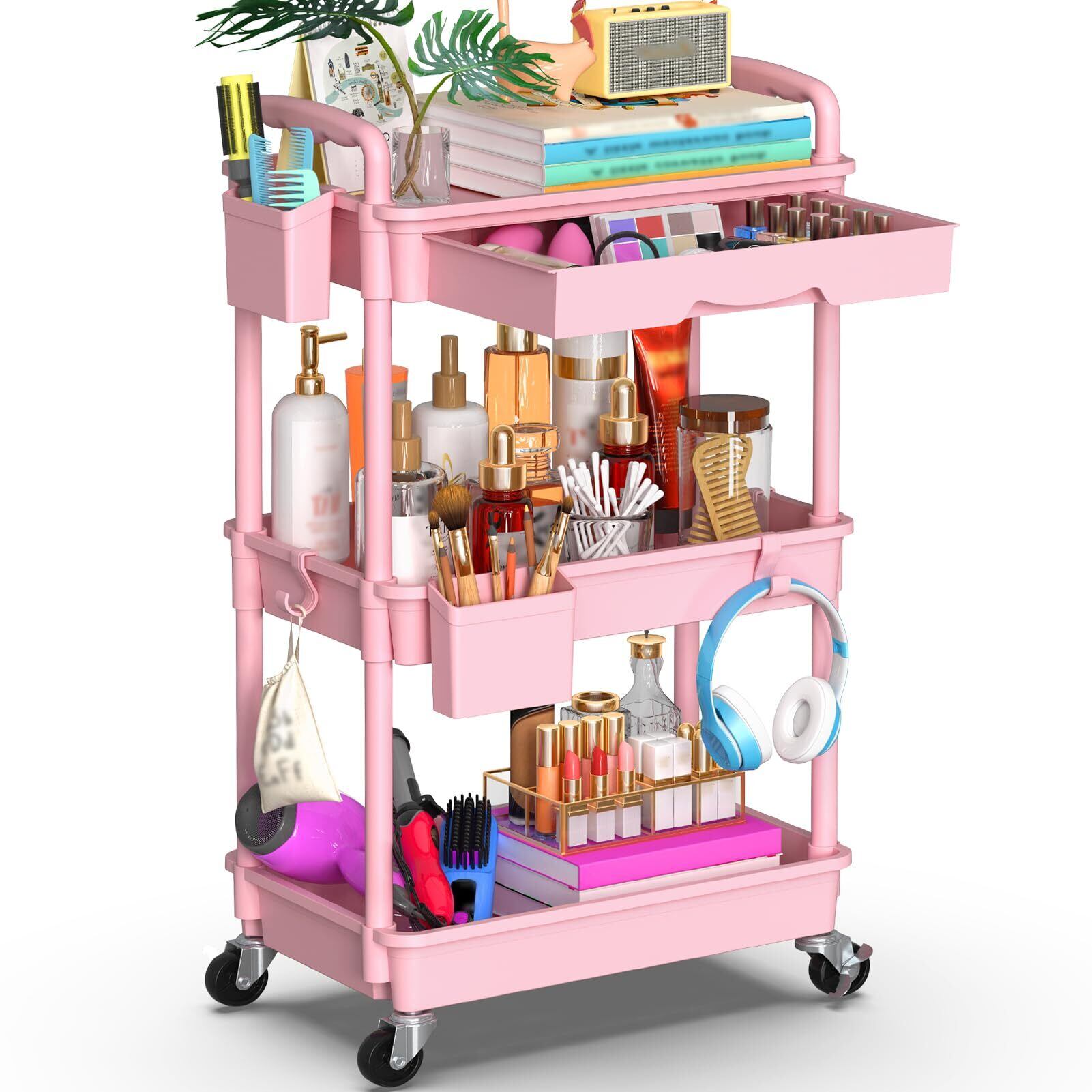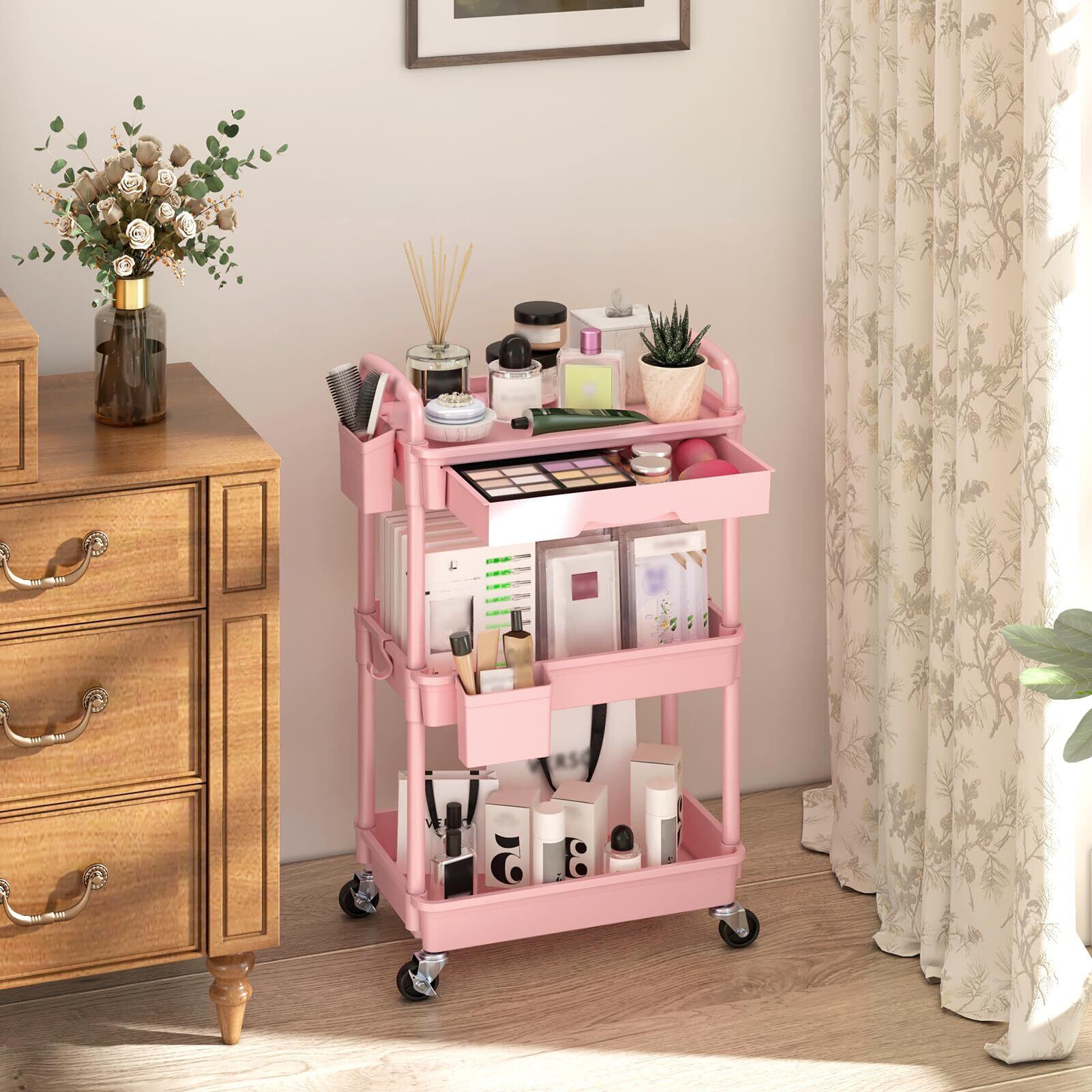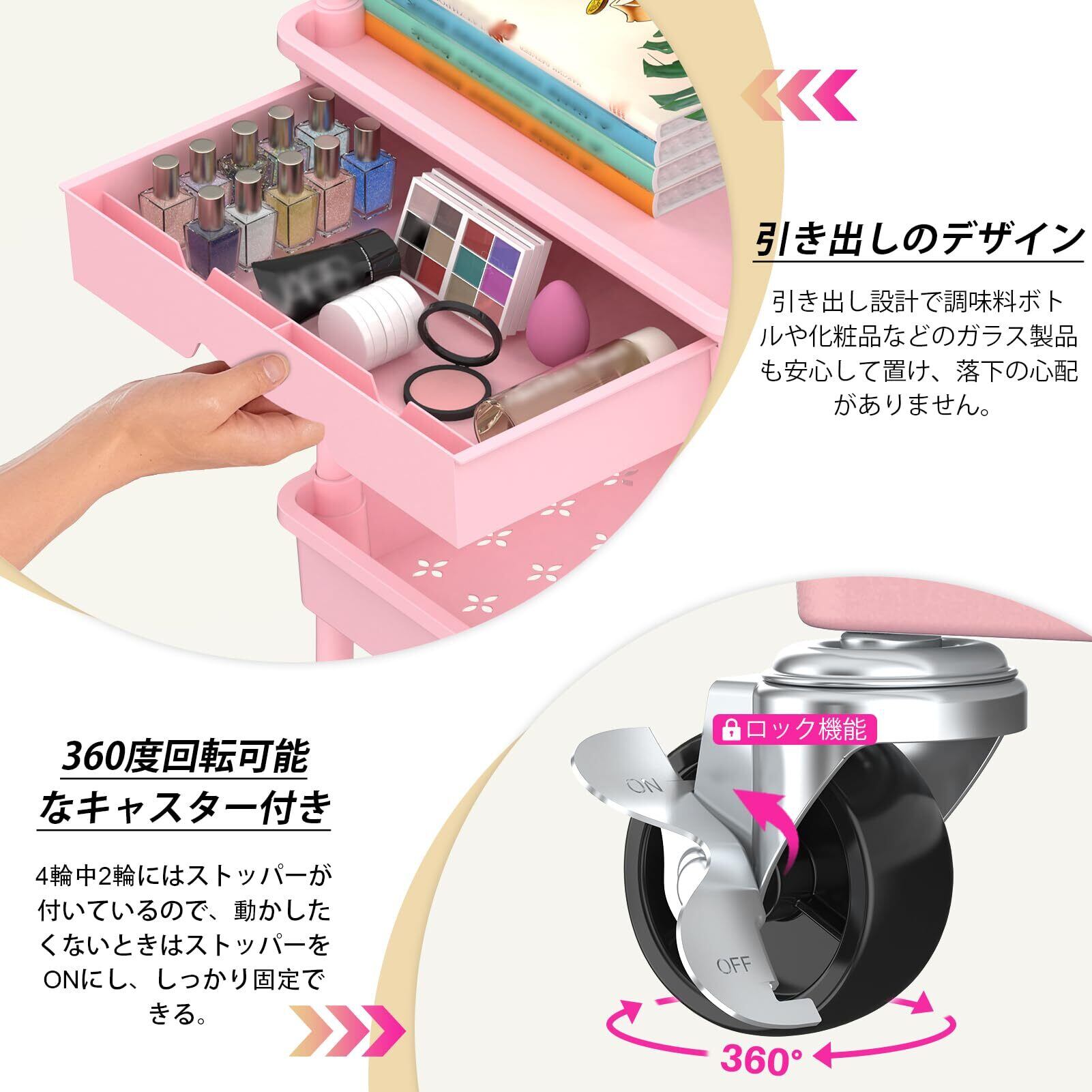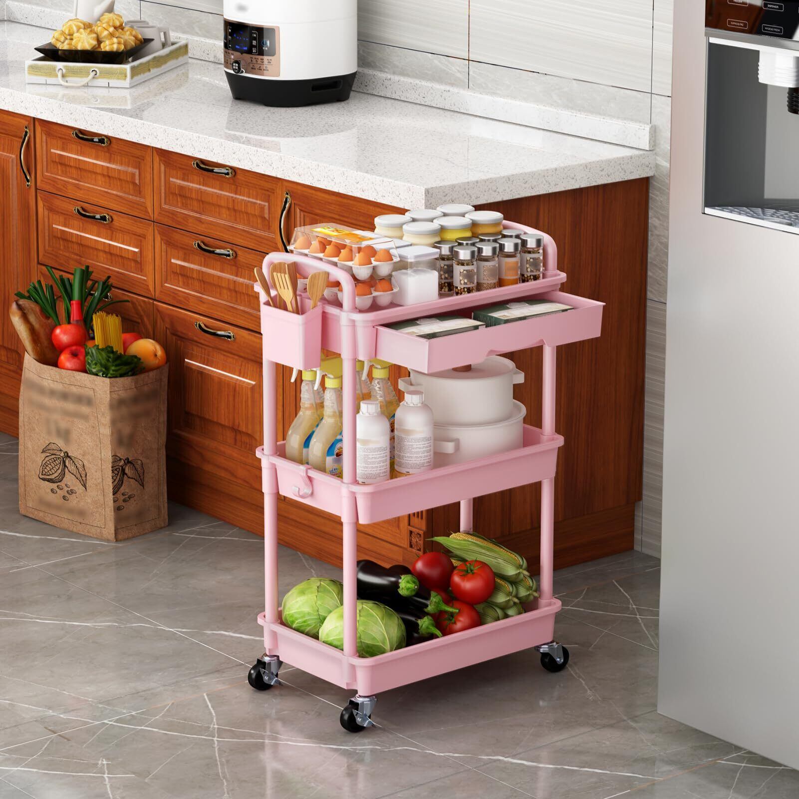 Goovilla キッチンワゴン ローリング 3段 引き出し付き ハンドル付き 収納カップ 仕切板付き 多機能 小物 隙間収納 バスケットラック バスルーム オフィス キッチン用 収納ワゴン 幅37.8×奥行26.9×高さ75.9cm ピンク