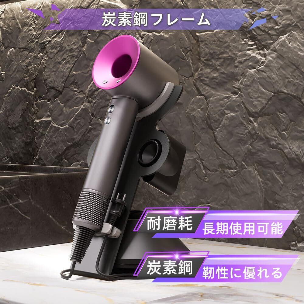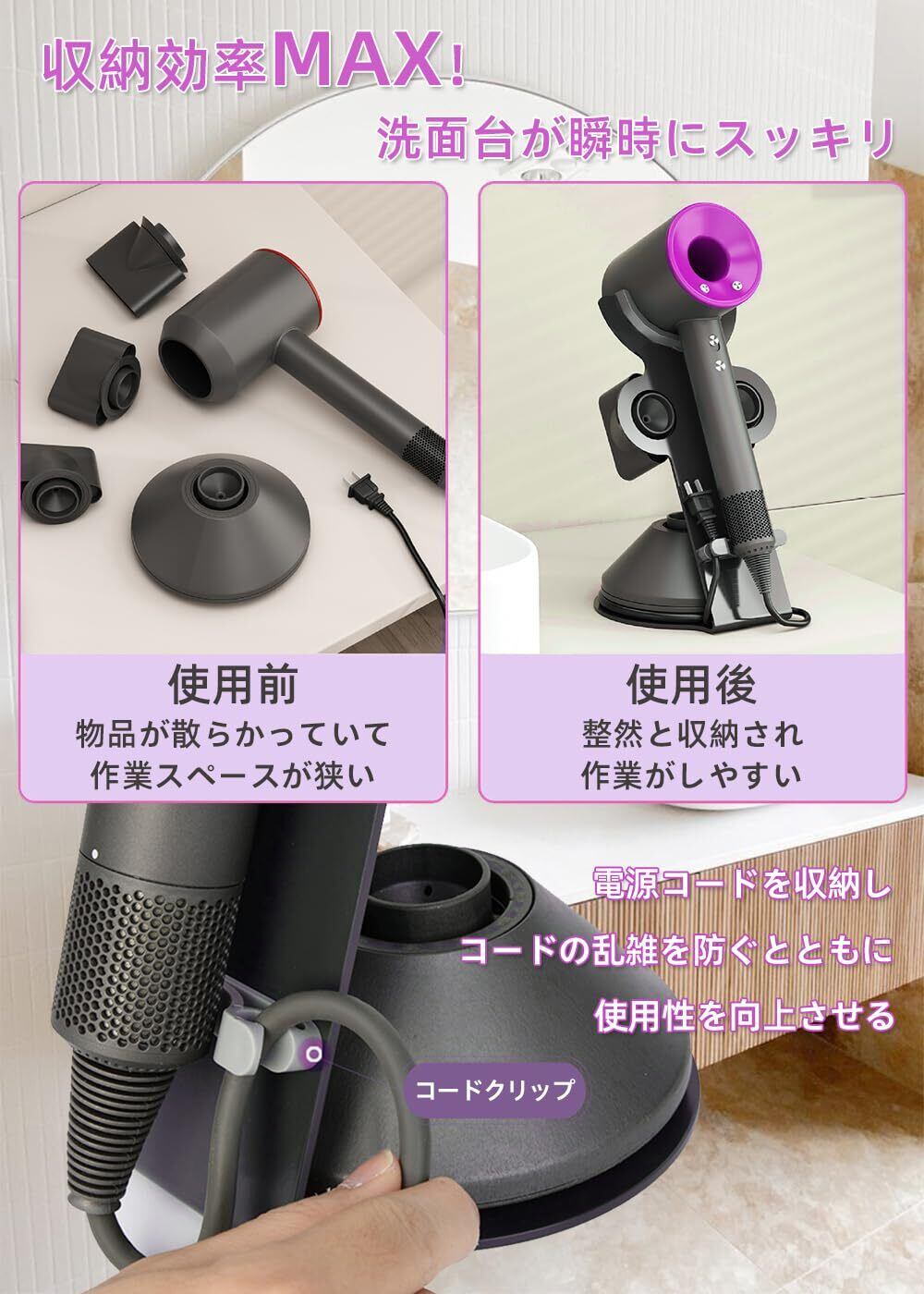 ドライヤーホルダー スタンド 収納スタンド 電源プラグ・コード整理機能付き 小物置き アタッチメント収納可能 滑り止め設計 省スペース 浴室・洗面所・寝室用 多機種対応