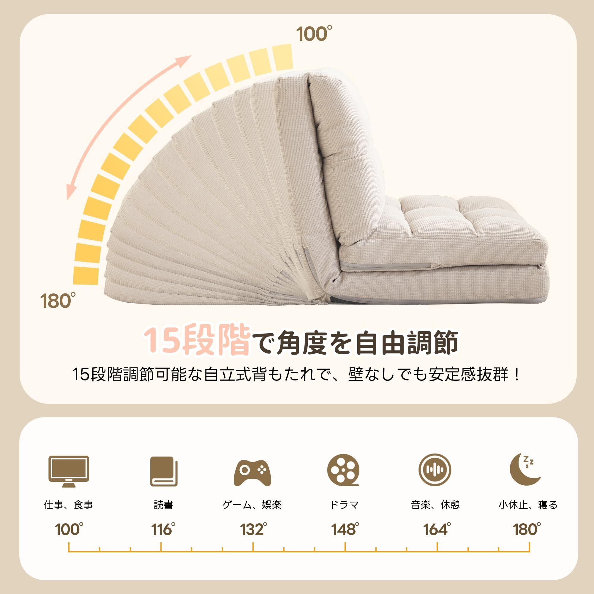 【多機能で使い勝手の良さ】ニーズに合わせて形を変えられ、快適な座椅子として使用できるだけでなく、最大 178CM のベッドにも広げられます。座る、横になるといった様々なシーンのニーズに応え、実用性に優れています。特に小さな部屋の空間に最適で、座椅子からベッドへの機能変換を実現します。 【優れた座り心地|ふかふかクッション】ふっくらとした詰め物素材を採用し、表面の触感が柔らかく、座る時も横になる時も非常に快適です。体に良いサポートを提供し、長時間使用しても疲れにくいです。 【サイズの使い勝手】座椅子の形の時は寸法がコンパクト(幅 50CM、高さ 48CM など)で、あまりスペースを取りません。ベッドに広げた時は十分な長さがあり、多くの人の体のサイズに合い、使用シーンも幅広いです。 【シンプルで美しい】デザイン外観はシンプルで上品で、細かいテクスチャがあり、様々なインテリアスタイルに簡単に溶け込み、空間に温かく優しい雰囲気を加えます。 【背もたれ 15 段階調整機能】背もたれには 15 段階の細かい調整ギアがあり、ほぼ垂直な座りのサポートから、だらけた半横になる角度、そしてほぼ平らに横になる休憩状態まで、それぞれの段階は心を込めてデザインされています。まっすぐ座って仕事や読書に専念する時も、リラックスしてドラマを見たり音楽を聴いたりする時も、あるいは体を完全に伸ばしてちょっと休憩したい時も、調整して自分の体のカーブと快適なニーズに最も合う角度を見つけることができ、首や背中などの部位にちょうど良いサポートを提供し、体の疲れを効果的に和らげ、様々な使用シーンでの快適な体験を的確に満たします。 【コンパクトでどこにでも置ける】このソファは非常に小さく、コンパクトです。寝室の片隅に置けば専用のくつろぎスペースに、書斎に置けば読書用の快適な座椅子に、狭いバルコニーエリアにも設置でき、気持ち良い眺めと休憩の場に変身させることができます。スペースの限られた小さな家であっても、広い空間に柔軟な小さな座るエリアを追加したい場合であっても、簡単に適合し、あまりスペースを取らず、様々なホームシーンのレイアウトにより柔軟で実用的な可能性を提供します。