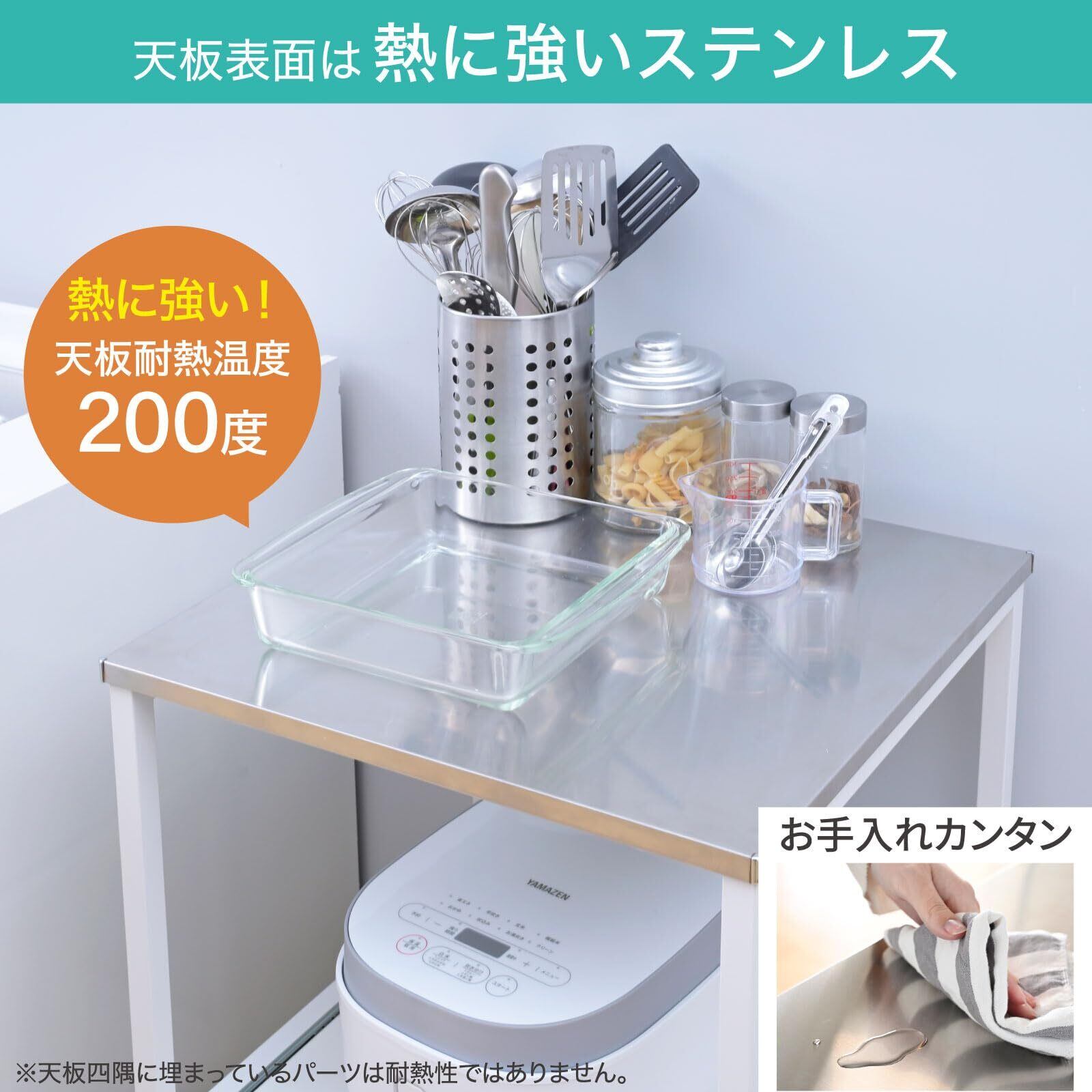 【熱に強いステンレス】天板表面はお手入れカンタンなステンレス製で、耐熱温度200度と熱にも強い仕様です。※天板四隅に埋まっているパーツは耐熱性ではありませんので熱い鍋等が直接あたらないようにご注意ください。