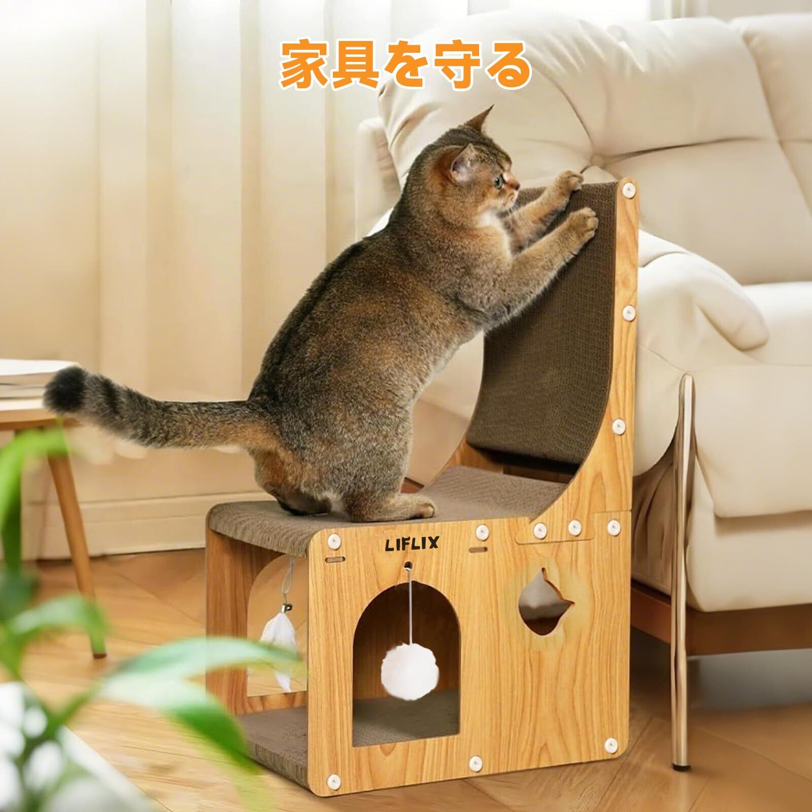 【多機能猫爪とぎ】h字型のデザインで、爪研ぎだけではなく、キャットハウスや遊び場としても使えます。爪とぎと隠れ家の組み合わせで、猫の様々なニーズに対応しています。