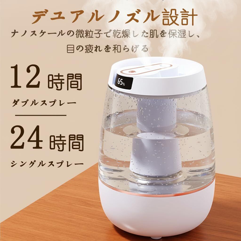 ️2つの加湿モードと自動シャットオフ機能 - この大容量加湿器は、連続ダブルスプレーモードと間欠シングルスプレーモード(2秒間隔)の2つのモードを搭載。連続モードは最大12時間、間欠モードは最大24時間の使用が可能です。どちらのモードも自動でオフになるため、長時間使用しても安心してお使いいただけます。最適な加湿効果を提供し、オフィスや寝室、リビングルームなどで活躍します。