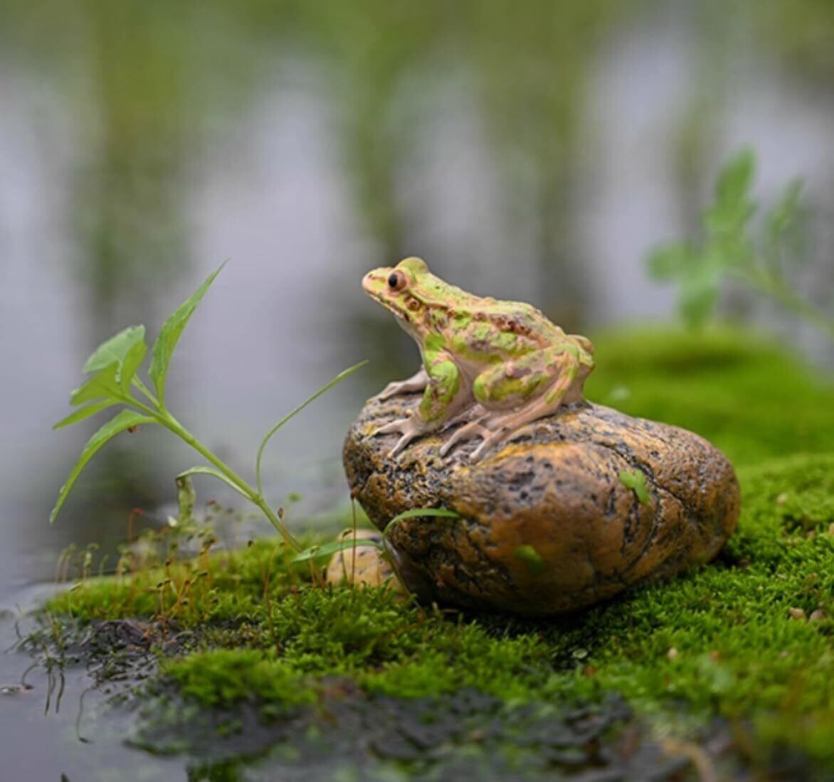 【リアルなカエル置物】可愛い表情、大きめの目、表面は艶やかなクリアー塗装が施されていて、まるで本物のカエルです。これをガーデンに、花壇に飾ったりするの気持ちいいでしょう!
