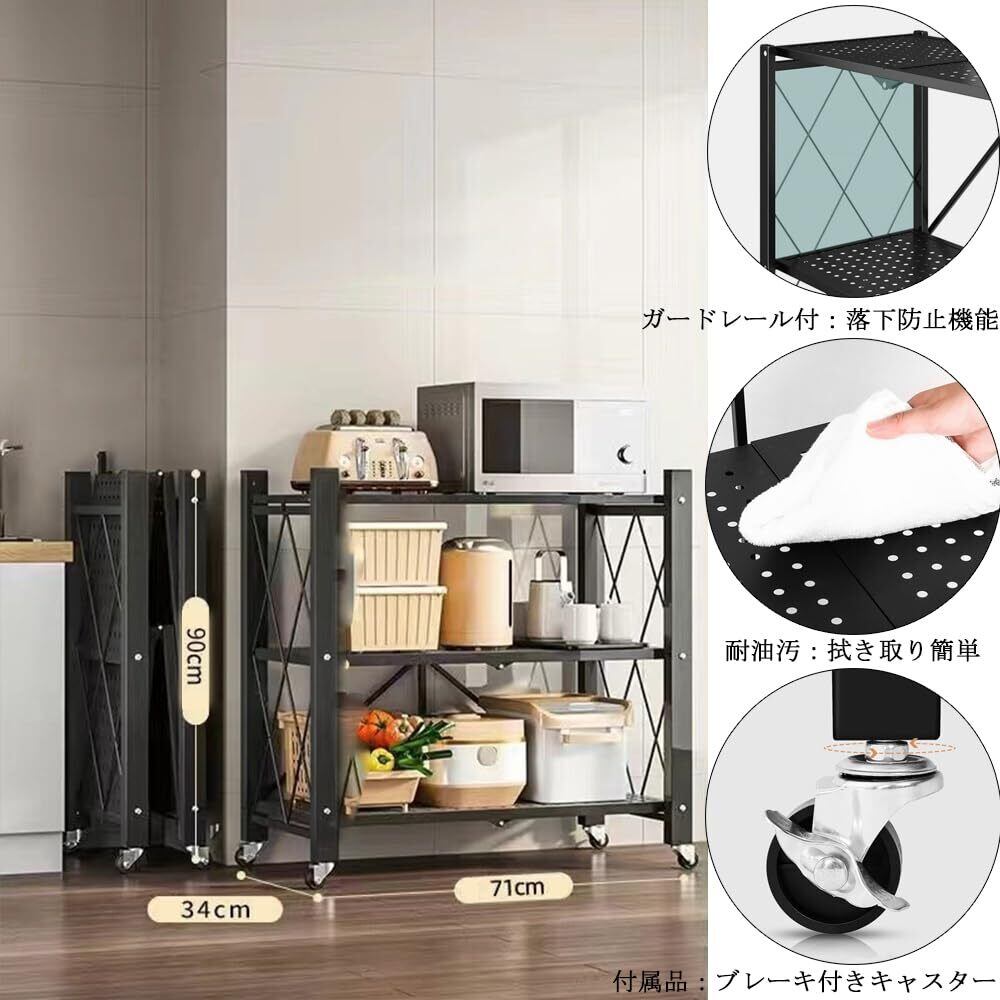 折りたたみ式収納ラック 3層 スチール キャスター付き 錆止め加工 収納棚 折りたたみ式 組み立てが簡単 スチール棚 頑丈 メタルシェルフ リビング ワイヤー シェルフラック おしゃれ 食器庫・家庭倉庫・キッチン・室内寝室収納・業務用 (ブラック)