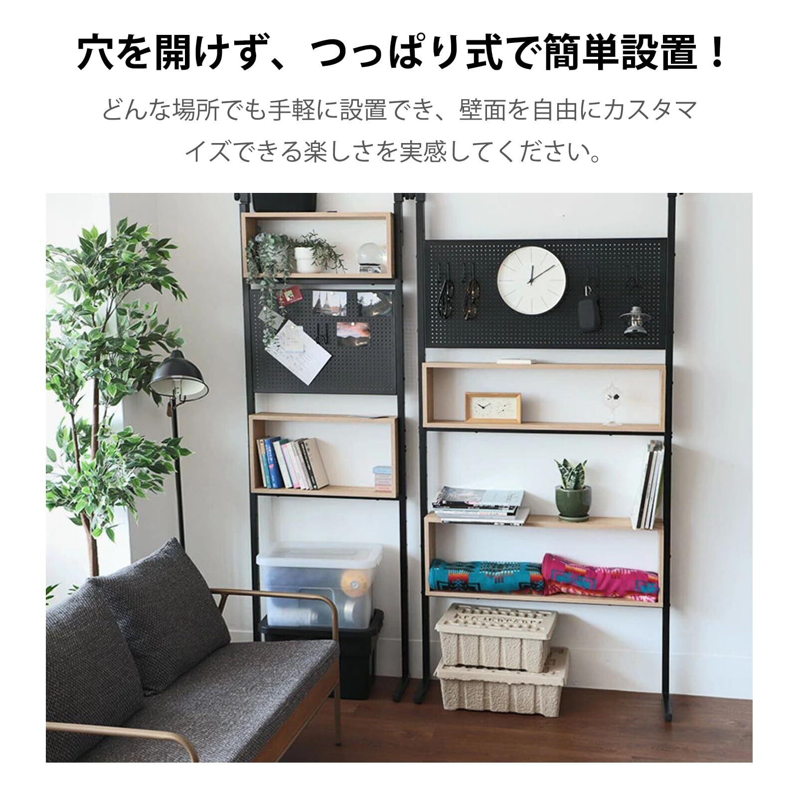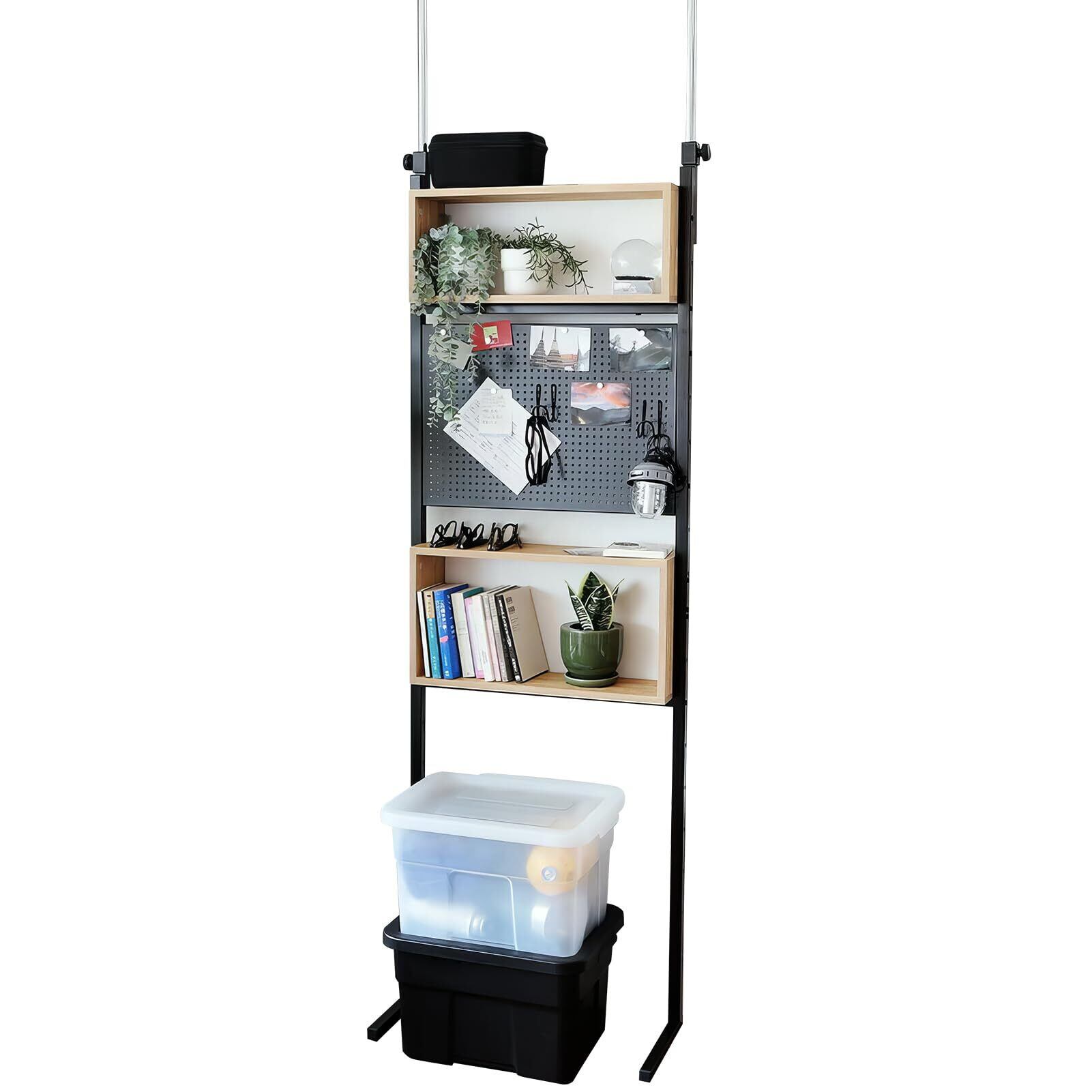 DEWEL 突っ張りラック 高さ調整可能(194.5-275cm) つっぱり棚 つっぱり棒 パンチングボード 有孔ボード付き マグネット ペグラック対応 壁穴あけ不要 賃貸OK スリム省スペース オープンシェルフ ウォールラック 収納ラック (ブラック×ナチュラル, 60cm)