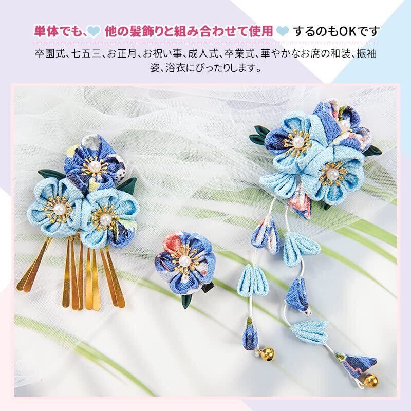 髪飾り 七五三 3点セット 成人式 浴衣 髪 飾り 花 袴 着物 振袖 和装 卒業式 鈴付き つまみ細工 女の子 子供 ヘアアクセサリー 5カラー (ブルー 3点セット)