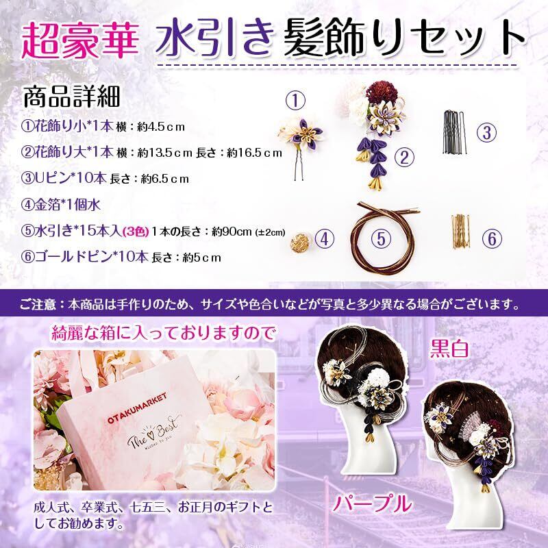 【和装髪飾りセット内容】花飾り2点+水引き長さ90cm*15本入+Uピン10本+ゴールドのピン10本+金箔1個セット。水引きを付けて、どの方向から写真を撮っても映えるようにするのも可愛いですね。綺麗に梱包しますので、新年、誕生日、クリスマス、バレンタインデーギフトとしてお勧めます。浴衣や着物などの和服だけでなく、普段使いにも便利な一本タイプです。