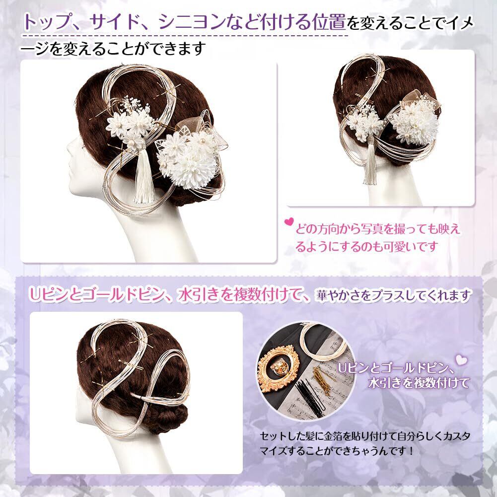 [OTAKUMARKET] 髪飾り 成人式 振袖 水引き 袴 着物 和装 卒業式 浴衣 花 結婚式 髪 飾り コーム 成人式髪飾り 24点 ヘアアクセサリー 金箔 ピン 付き 4カラー (白)