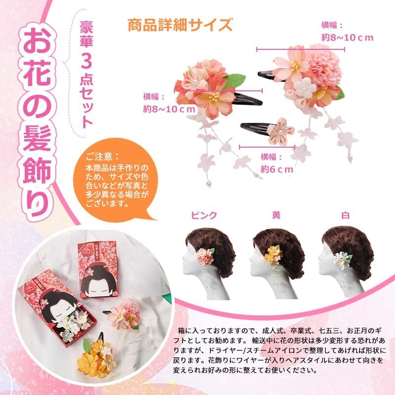 【髪飾り用途】お花の髪飾りです。アップヘア、サイドアップ、お団子、編み込みなど人気のまとめ髪の補助やアクセントにオススメです。卒園式、七五三、お正月、お祝い事、成人式、卒業式、華やかなお席の和装、振袖姿、浴衣にぴったりします。七五三の髪飾りは前撮りに最適。