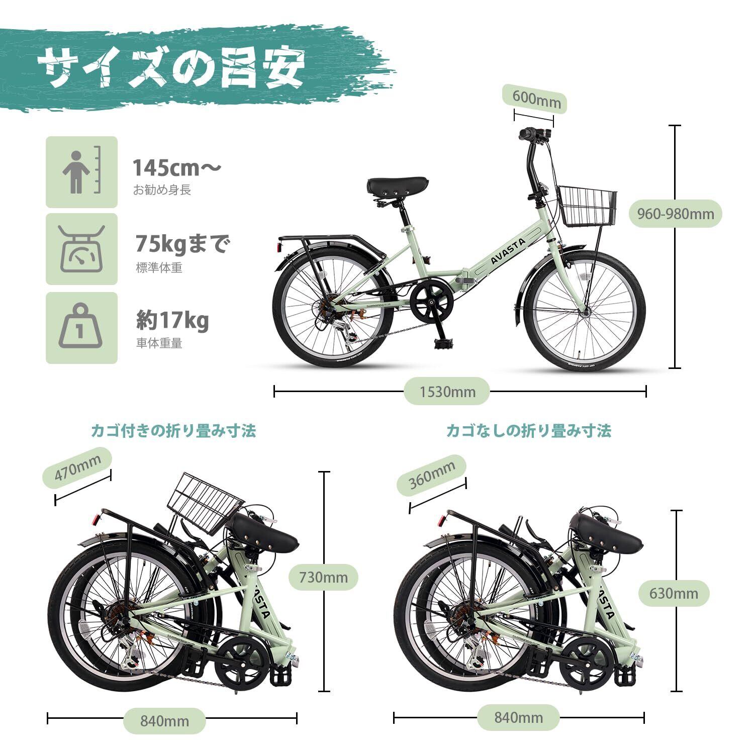 【本体サイズ】153cm×60cm×960cm、【サドル高さ】70cm~88cm、【折りたたむサイズ】81cm×36cm×63cm、【前かご付き折りたたむサイズ】84cm×47cm×73cm、【車重】17kg、【最大荷重】75kg、【お勧め身長】145cm~。