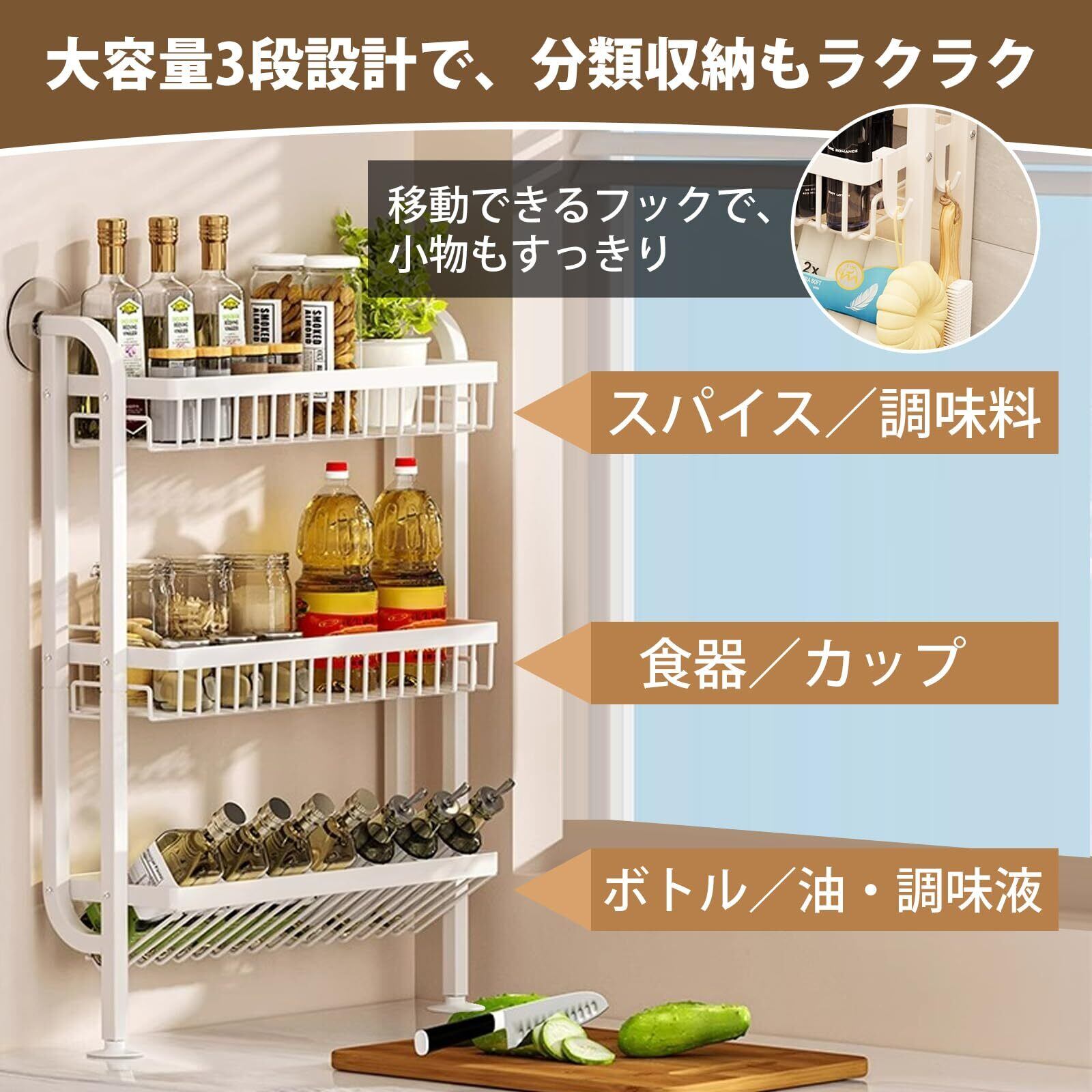 【強力吸盤と頑丈設計で、安定感抜群】 上上部は吸盤でしっかり固定し、下部は吸盤付き脚部がしっかり支える安定構造。 カーボンスチール素材を採用し、防錆・防水・防油に優れ、長期間きれいに保てます。 各段約10kg、合計30kgまで耐えられる頑丈設計で、重いボトルや食器を置いても揺れにくく安心。 調味料棚やスパイスラックとしても安定感抜群です。