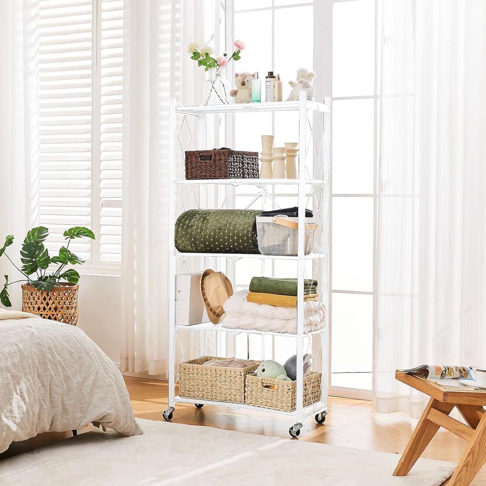4段 折りたたみ棚 幅71×奥行34×高さ127cm 収納ラック スチールラック 折り畳みラック メタルラック キャスター付き レンジラック オープンシェルフ 頑丈なキッチンラック 金属 組み立て不要 Folding Shelf (White, 幅71×奥行34×高さ127cm)