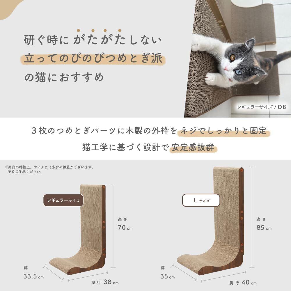 【選べる2サイズ&2カラー】 猫の体格やつめとぎスタイルに合わせてレギュラー・Lサイズの2サイズを揃えています。レギュラーは高さ70cm、Lサイズは高さ85cm。大きめの猫や垂直伸びスタイルが好きな猫にはLサイズがおすすめです。 カラーはライトブラウン・ダークブラウンの2色から、おうちのインテリアや猫の経路に合わせてお選びいただけます。 ウッドプレミアムは外枠が木製(MDF板)でサイドのパネルがなく、スタイリッシュな外観に猫壱のロゴマークを入れたシンプル可愛い木目調デザイン。固定ネジのカラーを外枠と同色にし、全体のデザインによく馴染むよう配慮しいています。