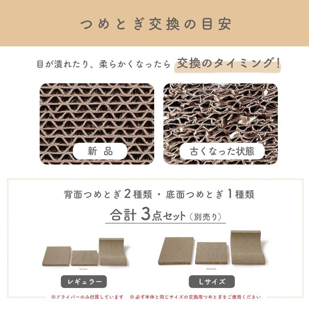 【つめとぎパーツは交換可能。背面つめとぎは裏返し使用も可】 バリバリボード ウッドプレミアムは3枚のつめとぎパーツで構成されており、いずれもつめとぎパーツのみの交換が可能です。2枚の背面つめとぎは裏返しても使用できます。傷んだ部分だけを交換しながら、自分のにおいの染み込んだ、お気に入りのつめとぎを長くお使いいただけます。 まるごと買い替えが不要なので経済的で、猫と暮らすあなたにも嬉しく、環境にも優しい仕様です。 ※つめとぎパーツと外枠はプラスチックネジで固定する仕様です。