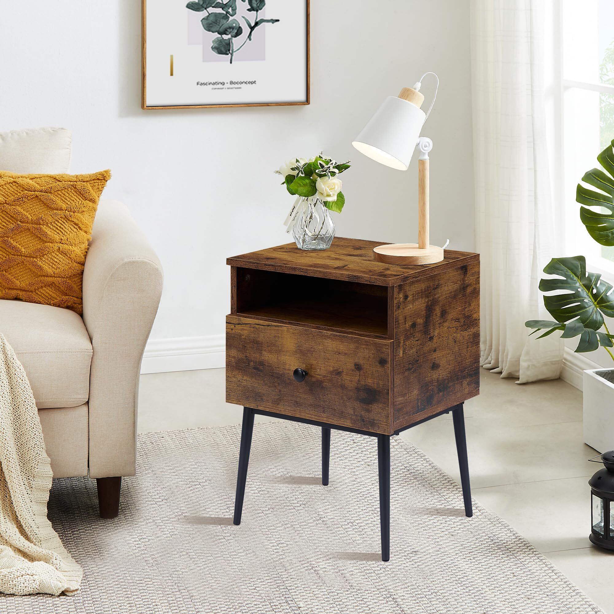 VECELO サイドテーブル ナイトテーブル ベッドサイドテーブル アンティークブラウン 幅40×奥行35×高さ55cm 引き出し付き 収納棚付き ベッド横 ソファ横 おしゃれ