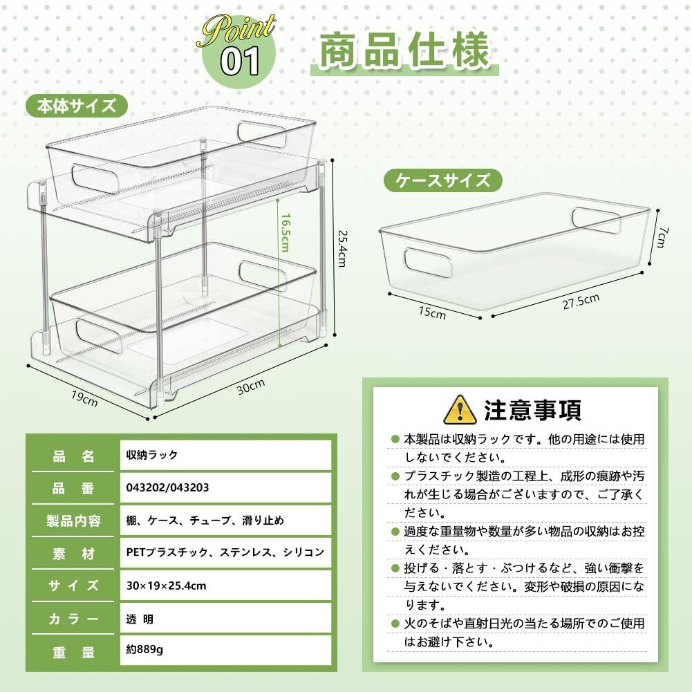 【透明デザインで一目瞭然】シンク下収納ラックは、一般的な収納ラックやキッチンラックとは異なり、完全な透明デザインを採用しています。 スタイリッシュで高級感があり、中身が一目瞭然のため、必要なアイテムを素早く取り出すことができます。 ABS樹脂を使用しており、耐久性に優れ、汚れがついても湿布で簡単に拭き取れます。 お手入れも非常に簡単で、長期間使っても美しい状態を保てます。