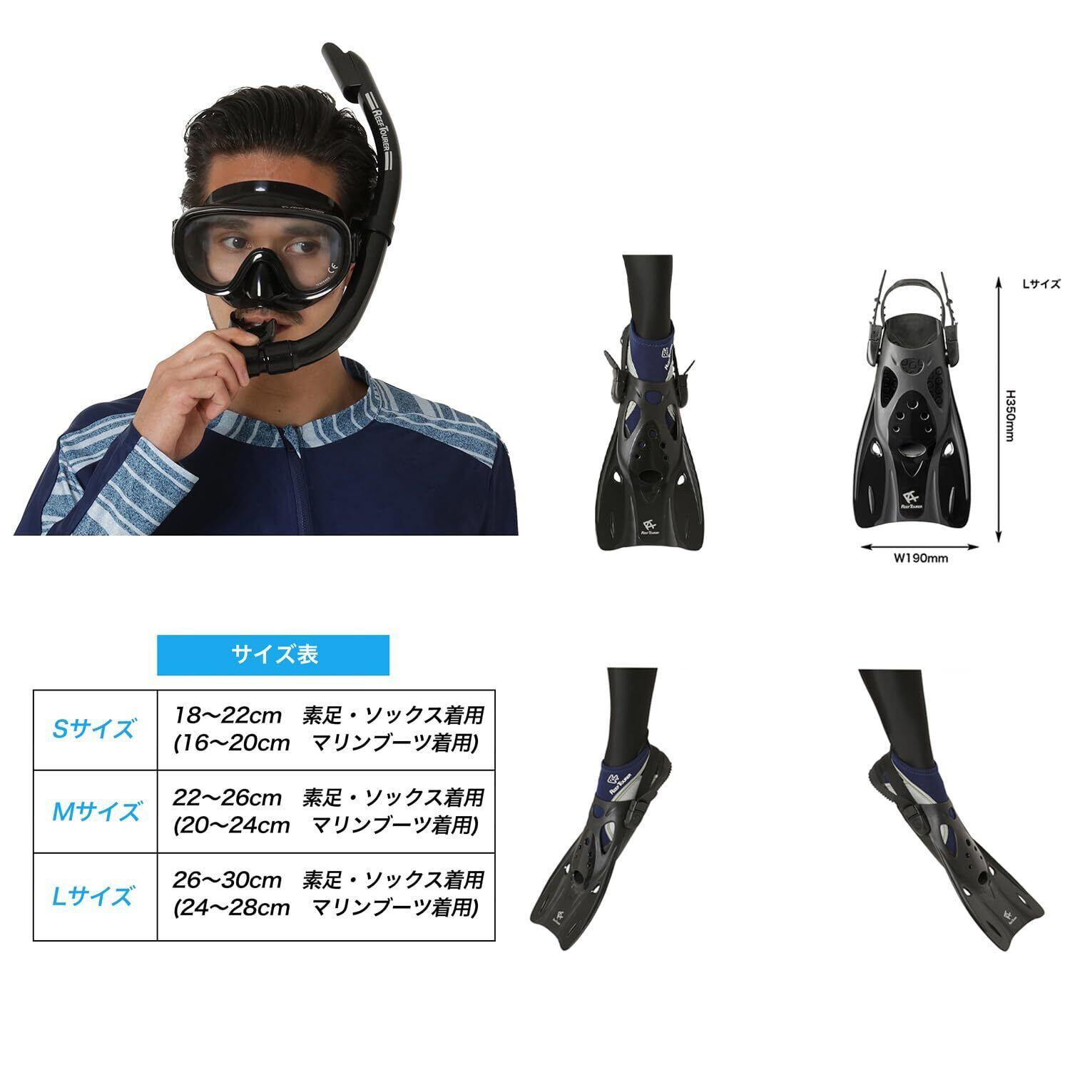 【 限定】 リーフツアラー(REEF TOURER) メッシュバック付 シュノーケリング 3点セット 10歳~大人用 パノラマ広視界マスク+波よけガード付きシュノーケル+軽量コンパクトフィン 【ブラック/ホワイト】 【S/M/Lサイズ】 RP0104P