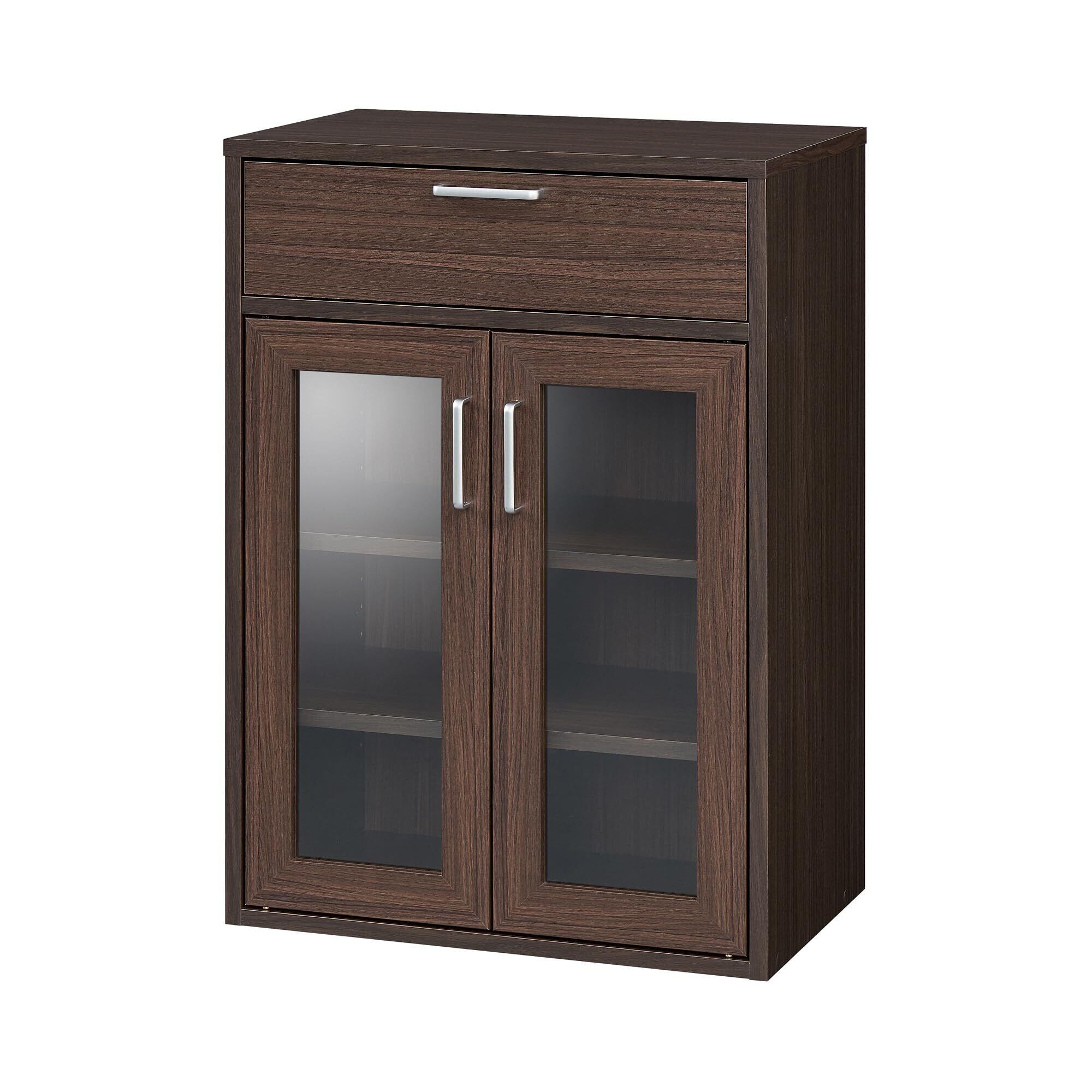 シンプルであきのこないナチュラルな木目柄のフルニコシリーズ。FUL-8055GH DKはベーシックな機能のキャビネット・食器棚。癖のない木目のシートは、一人暮らしのスタートや買い足しにちょうど良いテイスト。引出にはスチールの頑丈なスライドレールを採用。中身をクリアに見せる開き戸のガラス扉はシンプルなシルバーの引手です。移動棚は2枚付属。3cmピッチで収納物に合わせて高さの調整が可能です。お客様組み立て商品。生産は創業50年以上の組立家具専門メーカー。株式会社白井産業のベトナム工場が品質に自信を持ってお届けします。