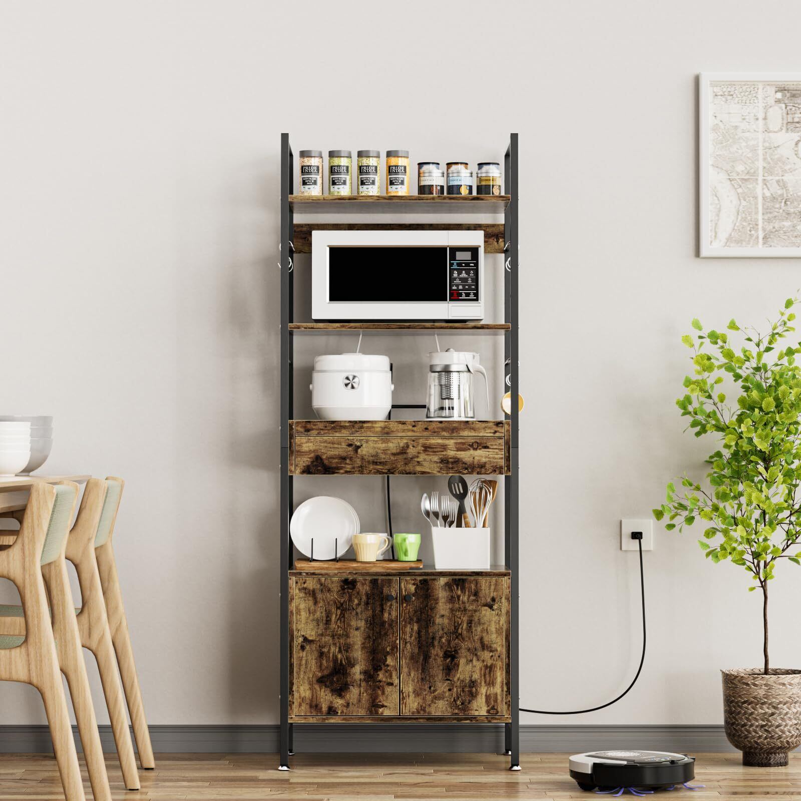 DEWEL キッチンラック キッチンワゴンスリム レンジ台 扉付き食器棚 幅60×奥行36×高さ162.5cm 6段式 レンジラック レンジボード ベイカーラック カウンターキッチン キッチン収納 大型レンジ対応 一人暮らし スライド棚 高さ調整可動棚 引き出し付き 3口コンセント付き&S字フック6個付き オープンシェルフ レトロカラー