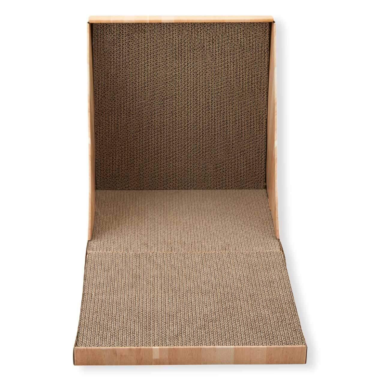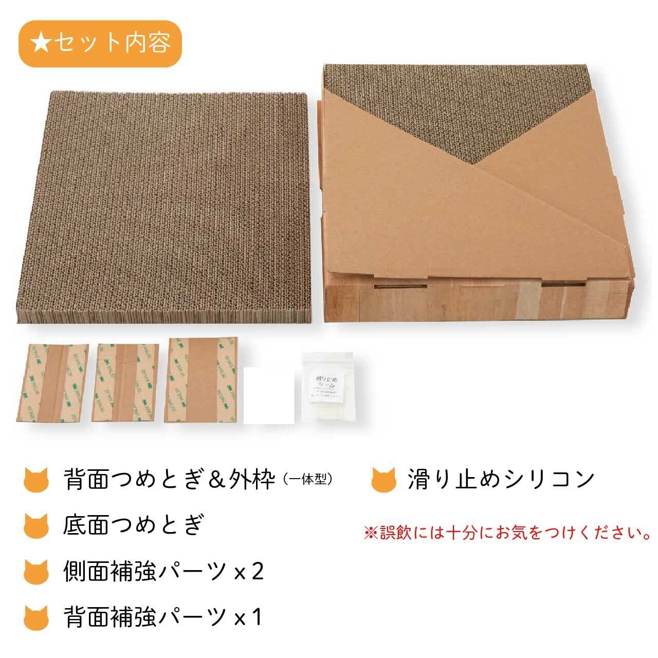 【こだわり抜いた原材料】つめとぎ部分に使用しているダンボールは、 原料の100%が紙。内10%はニュージーランド産原パルプ紙を使用。 大切な猫に使用するつめとぎなので、品質にはとことんこだわりました。 原料の品質が良いため、とぎカスも出づらくなっています。 また、つめとぎ部分は目の細かい、薄いダンボールを張り合わせているので、 密度が高く、猫のとぎ甲斐アップだけでなく、耐久性も持たせています。 ダンボールを貼り合わせる糊は植物由来の糊を使用しています。"