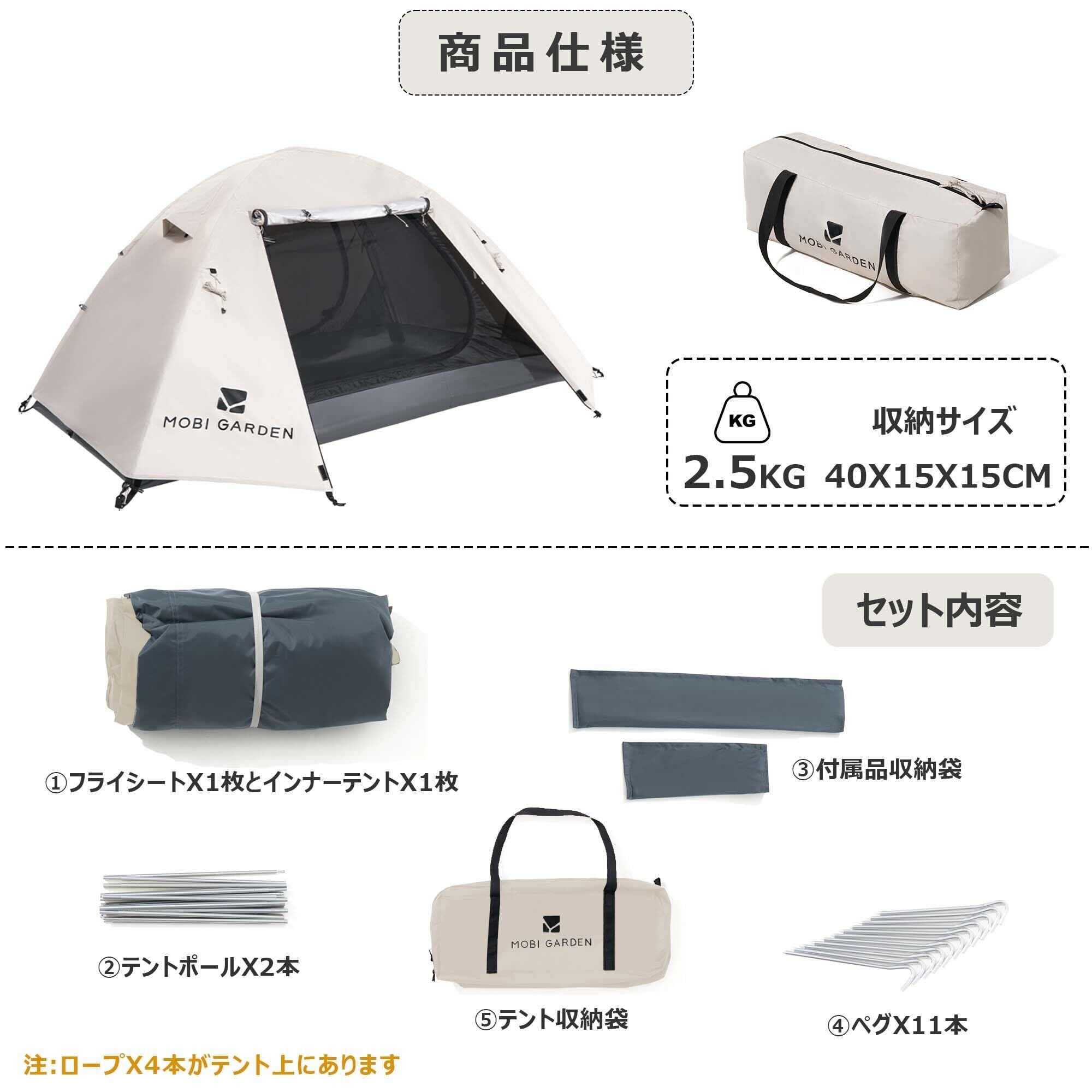 MOBI GARDEN テント ソロテント キャンプテント 1-2人用 二重層 軽量 コンパクト アルミ製ポール 撥水加工素材 UVカット アウトドア 簡単設営 収納バッグ付き キャンピング 登山