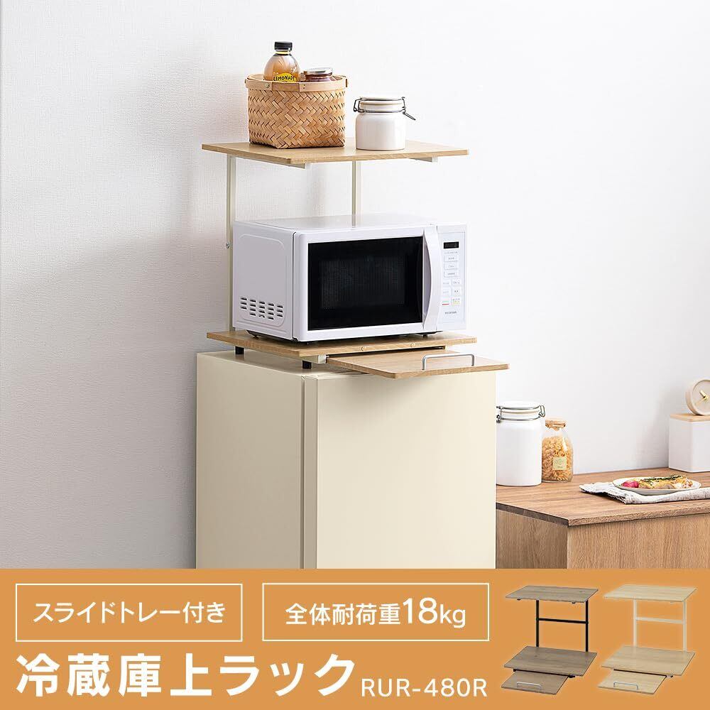 アイリスオーヤマ 冷蔵庫上ラック レンジラック ホワイト/ライトナチュラル 幅47.4×奥行43.4~67.1×高さ47.2 キッチンスペースを有効活用 家電から小物まで場所を取らずにすっきり収納 料理の一時置きができるスライド棚 一人暮らし 汚れにくく耐水性のある材質 お客様組立 隙間収納 RUR-480R