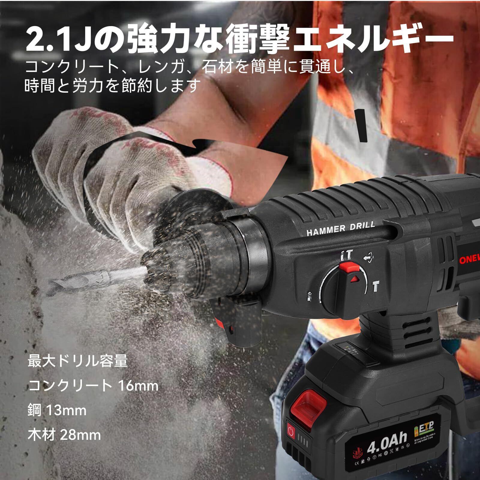 ONEVAN 充電式ハンマードリル ハンマー ドリルマキタ18Vバッテリー対応 コードレス 振動ドリル ブラシレスモーター 無段変速 4モード切替 石材・壁・金属・木材の穴あけ ハツリ(斫り)工事 日本語取扱説明書付き (本体+バッテリー×2)