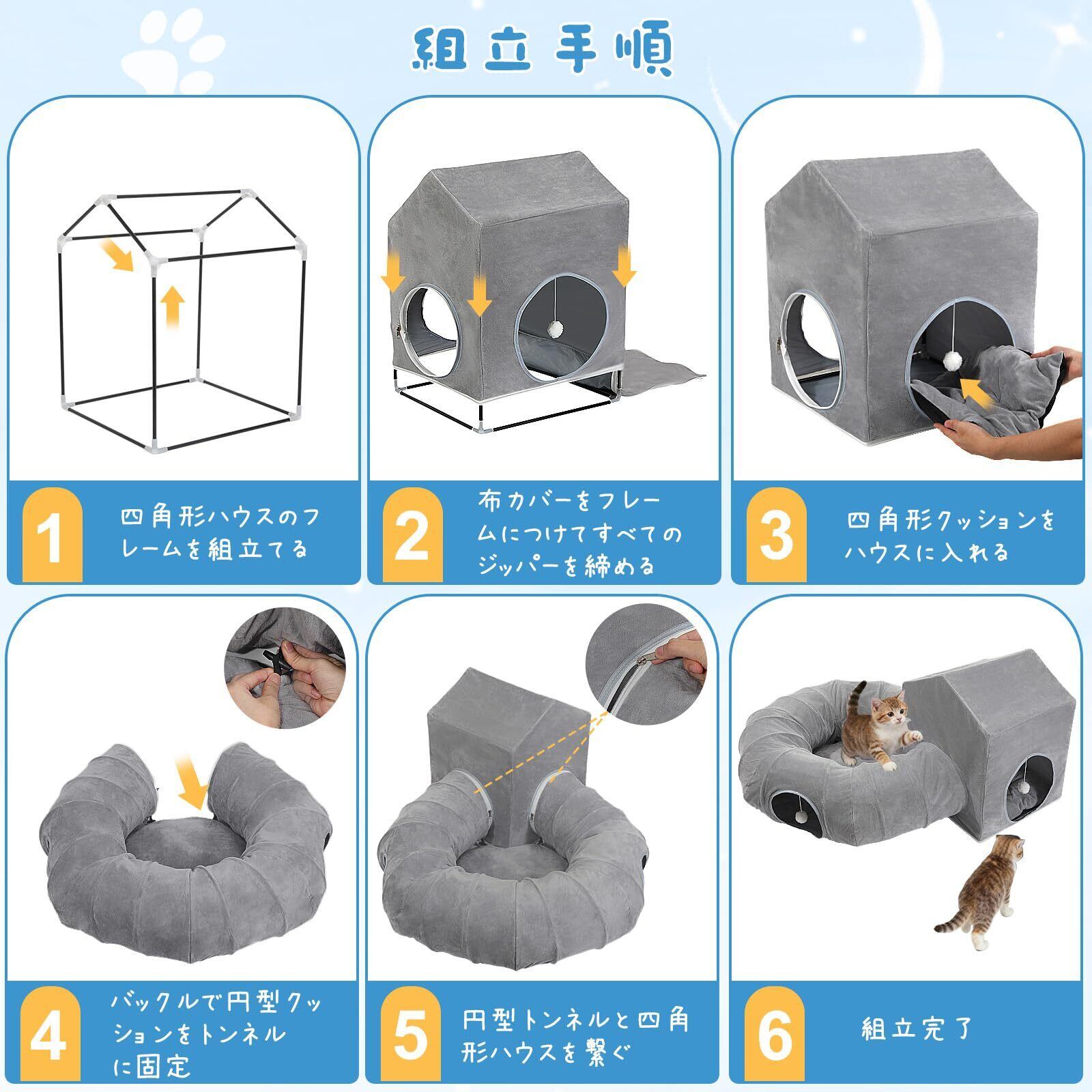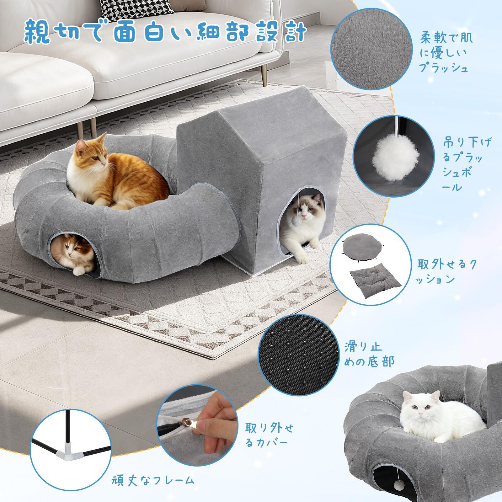 「各種小動物に適用」 本品は様々なペットにお楽しみいただけます。猫はもちろん、小型犬やウサギ、フェレット、モルモットなどの小動物にもご利用いただけます。トンネルは小さな探検家たちの好奇心を刺激し、ハウスはくつろぎの隠れ家に。お留守番中の安心できる場所や、ゲージから出て遊ぶ時のプレイタウンとしても最適です。クッションの底部に滑り止めの粒があり、ご家族の一員であるさまざまなペットのための、万能なペットハウスとしてお役立ていただけます。